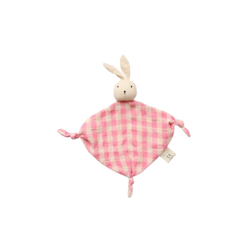 Doudou en gaze de coton tout doux, léger et lavable. Avec sa tête de lapin et ses carreaux roses, il est parfait pour rassurer bébé dès la naissance et constitue un joli cadeau de naissance.