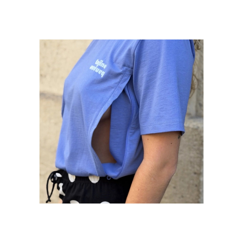 Ce tee shirt d’allaitement est pensé pour allier confort et praticité au quotidien. Sa coupe large offre un tombé fluide et agréable, tout en s’adaptant facilement à l’évolution de la grossesse grâce à son jersey doux et souple. Il est équipé d’un système de double ouverture par zips avec bandes de discrétion à l’intérieur, permettant d’allaiter simplement et en toute discrétion. Le flocage velours sur le cœur apporte une touche délicate et subtile à la pièce. Avec son col rond et ses manches courtes, il s’intègre facilement dans un vestiaire casual et confortable.