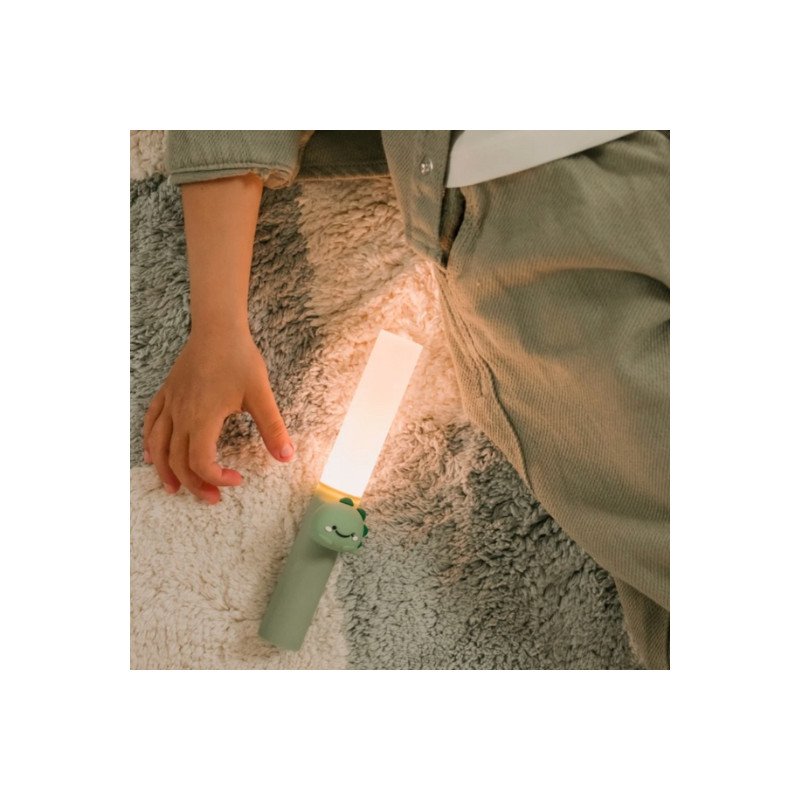 Lampe dinosaure verte 3-en-1, pensée pour accompagner les enfants à chaque moment de la journée. Portable et facile à utiliser, elle propose trois modes : Sommeil, Lecture et Marche, pour rassurer et amuser les petits explorateurs.