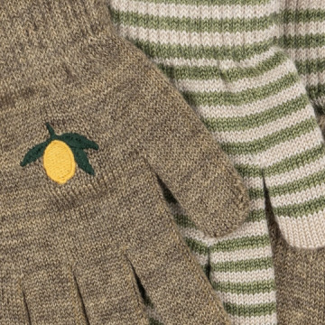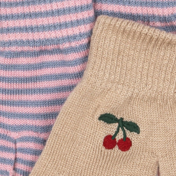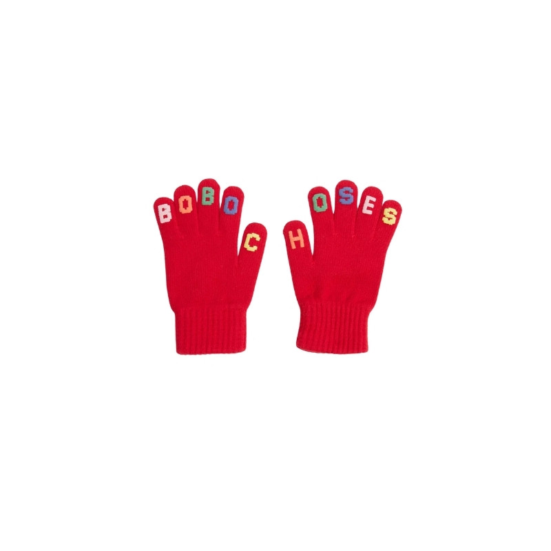 Gants enfant rouge Bobo Choses en maille douce, décorés de lettres colorées, alliant chaleur et style ludique pour l’hiver.