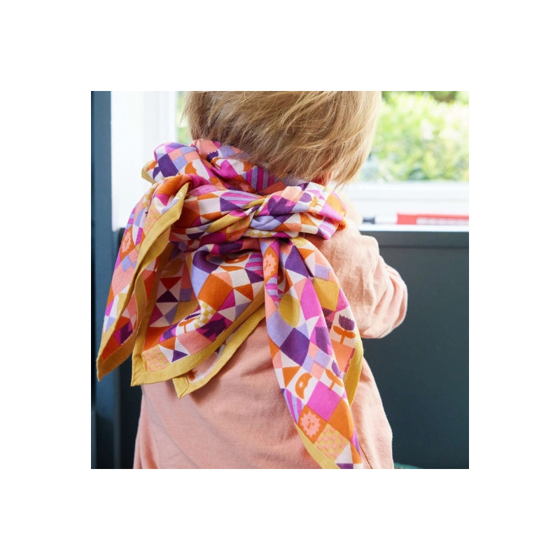 Foulard adulte en coton doux, imprimé artisanalement en Inde par blockprint. Léger et polyvalent, il se porte autour du cou, dans les cheveux, en ceinture ou accroché à un sac pour une touche unique au quotidien.