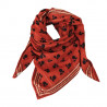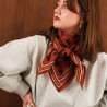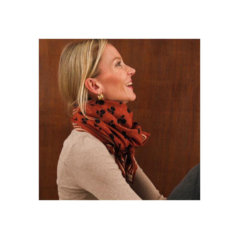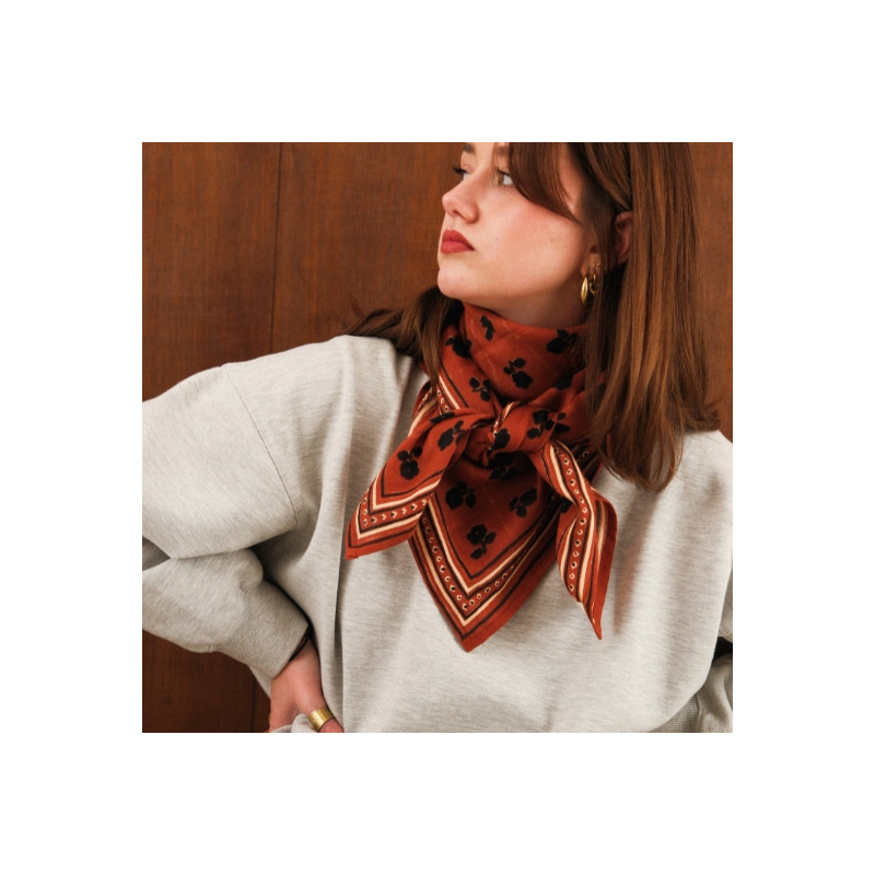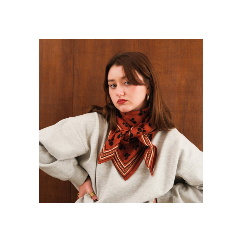 Ce foulard séduit par ses teintes chaudes et son motif floral délicat, qui lui confèrent un charme à la fois rétro et intemporel. Son fond rouge profond est sublimé par de petites fleurs sombres et un encadrement graphique contrasté, apportant du caractère tout en restant facile à associer.