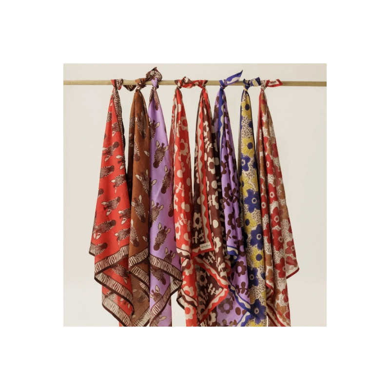 Son imprimé floral délicat apporte charme et raffinement à toutes les silhouettes. Porté autour du cou, en châle sur les épaules ou noué à un sac, il illumine instantanément une tenue avec une touche bohème et sophistiquée.