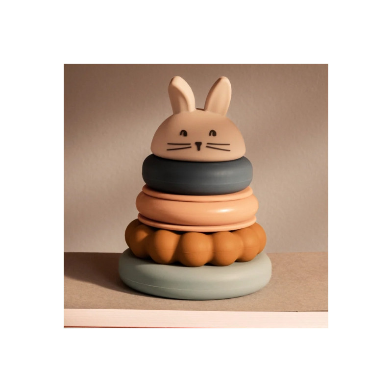 La tour à empiler Liewood revisite un classique avec des éléments ludiques et sensoriels. Chaque pièce a sa fonction : hochet, anneaux de dentition, tamis ou jouet de bain. Surmontée d’un adorable lapin, elle stimule la curiosité et offre des heures de jeu créatif.
