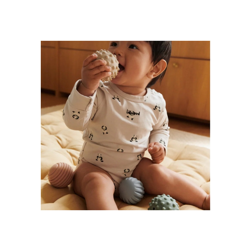 Ces cinq balles sensorielles en silicone souple invitent les tout-petits à presser, rouler, manipuler et mâchouiller en toute sécurité. Leurs textures variées stimulent le toucher et encouragent l’exploration sensorielle dès le plus jeune âge. Faciles à saisir par de petites mains, elles accompagnent le développement de la motricité fine tout en éveillant la curiosité.