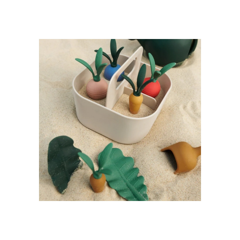 Le set comprend 1 pelle, 2 carottes, 3 betteraves, 2 feuilles de salade et 1 arrosoir, le tout fabriqué en silicone 100 % doux, durable et coloré. L’ensemble est rassemblé dans le panier de rangement polyvalent MAY, conçu en ABS recyclé à 60 %. Les enfants peuvent remplir le panier de sable, planter et récolter les légumes pour un jeu éducatif et immersif, parfait pour les beaux jours.