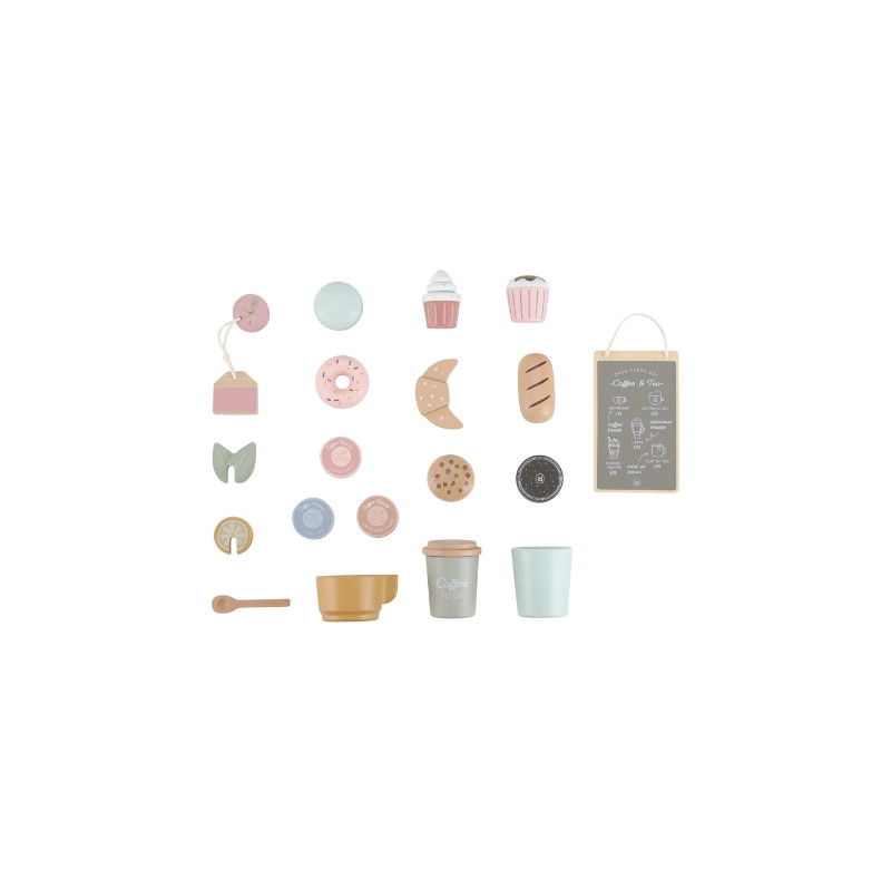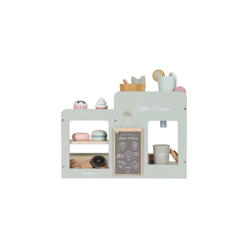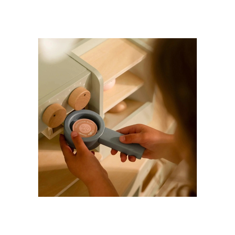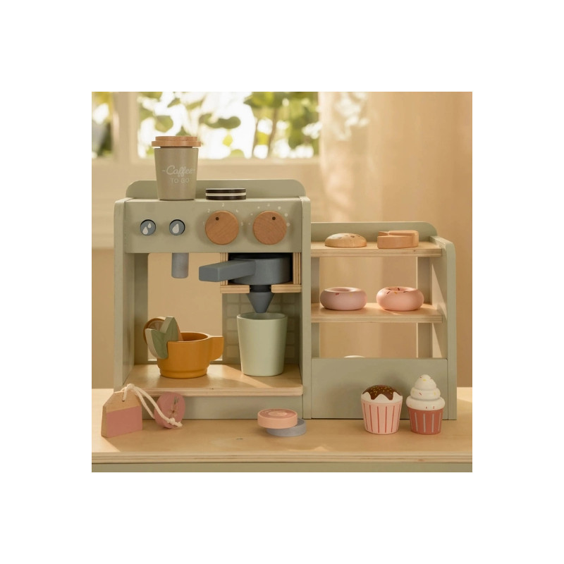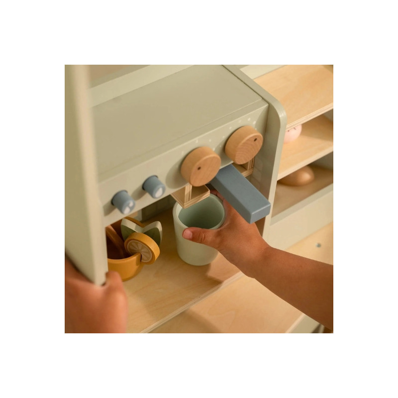 Ici la machine à café en bois Little Dutch. Cette cafetière est livrée avec deux tasses, deux petites cuillères et des capsules de café. Parfait pour stimuler l'imagination et la motricité de votre enfant.