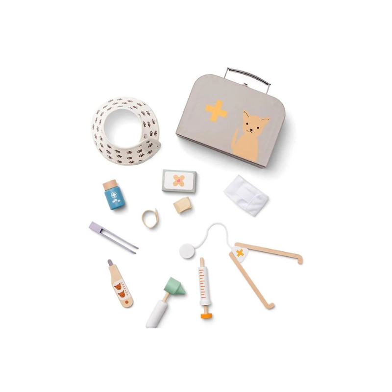 Faites la queue, le vétérinaire est arrivé ! Avec l’ensemble vétérinaire de chez Kid’s Concept, les enfants peuvent soigner leurs peluches comme de vrais professionnels. Le kit comprend tout le nécessaire pour ausculter, rassurer et guérir les amis à fourrure : seringue, flacon de « médicaments », nourriture pour chat en forme de poisson, stéthoscope, thermomètre, pince à épiler, otoscope et même un collier conique en tissu pour éviter que les animaux ne touchent leurs blessures après l’opération.