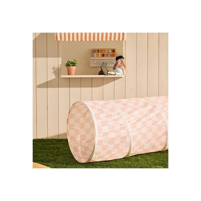 Tunnel de jeu abricot à carreaux signé Kid’s Concept : léger, pliable et parfait pour développer motricité et coordination, à l’intérieur comme dehors.