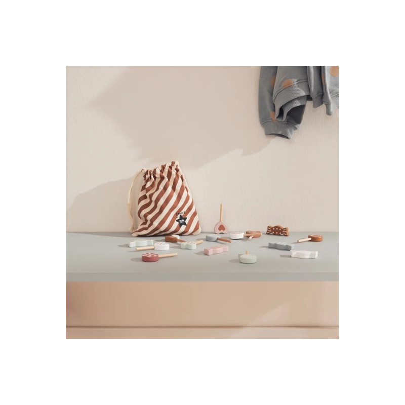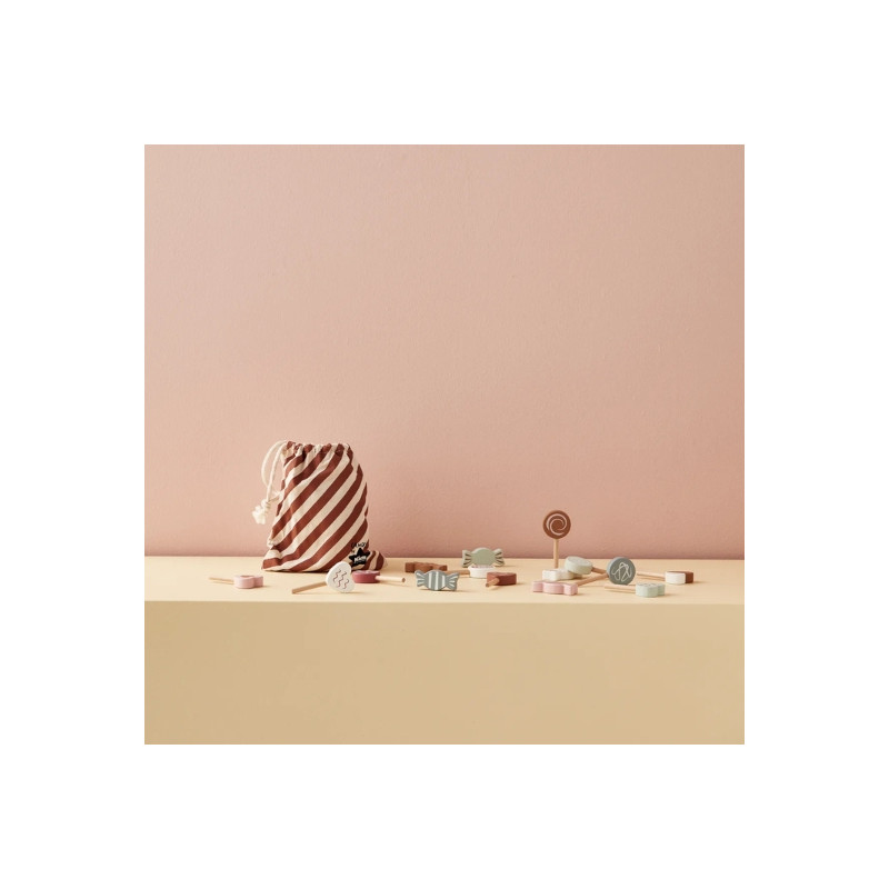 Assortiment de 15 bonbons en bois signé Kid's Concept avec sac de rangement 15 x 20 cm. Parfait pour les jeux de marchande et d’imitation.