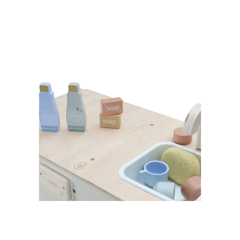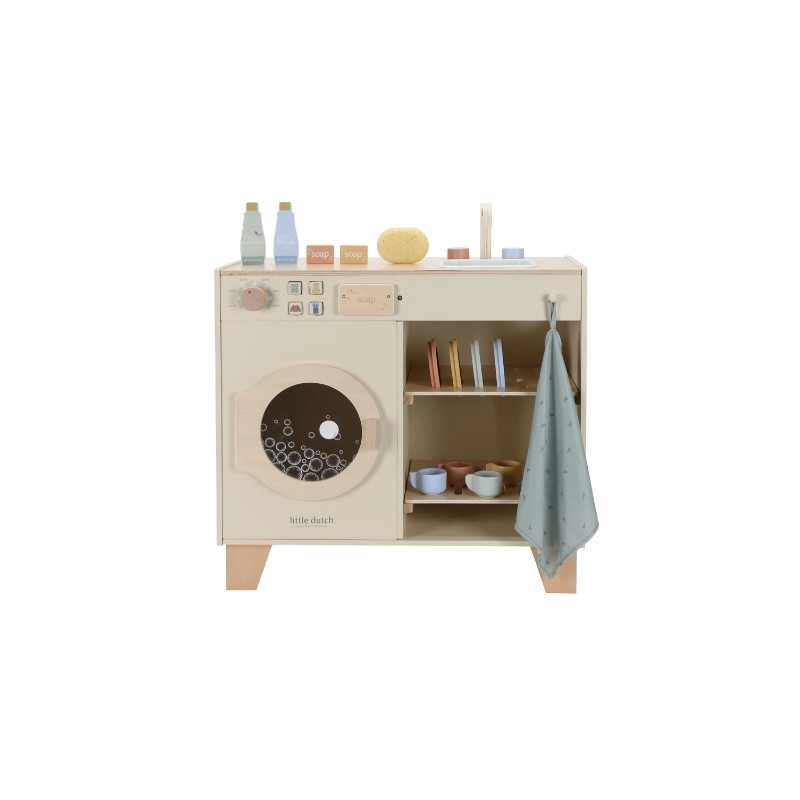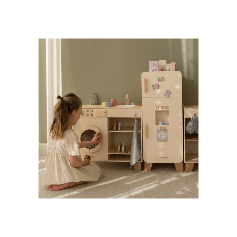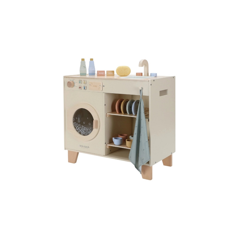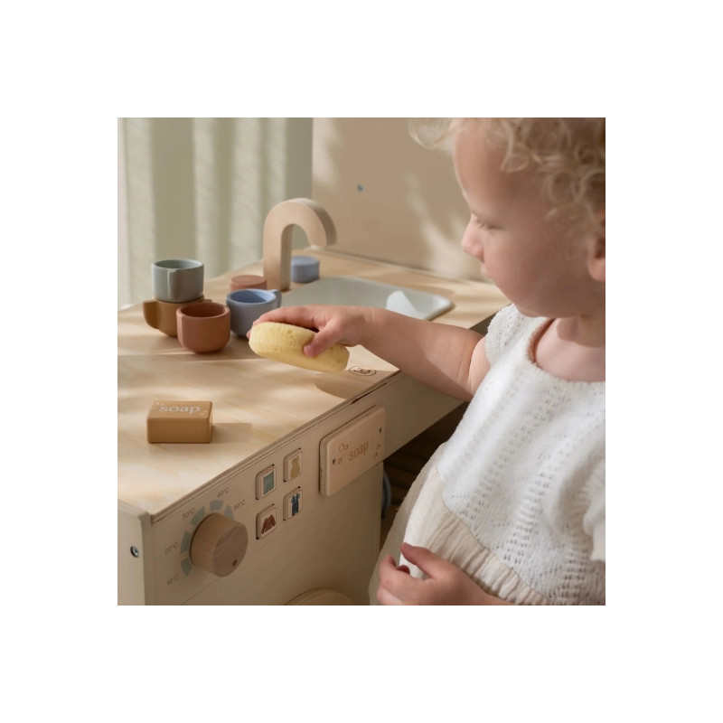 Avec cette machine à laver et lave-vaisselle en bois, les tâches ménagères deviennent un véritable jeu d’imitation. Le set comprend quatre tasses, quatre soucoupes, deux assiettes, du détergent, des blocs de savon et un torchon. Les enfants peuvent laver la vaisselle dans l’évier, faire tourner une lessive pour les vêtements de poupée et s’amuser avec les boutons illustrés et le compartiment spécial pour le savon. En l’associant à la station de cuisine et au réfrigérateur, ils peuvent créer un coin cuisine complet pour des heures de jeu immersives et créatives.