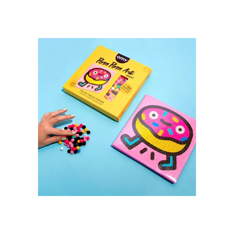 Pluie de couleurs et explosion de fun avec ce kit pom pom art signé OMY !  Laissez les petits artistes donner vie à un donut fluffy en collant plus de 500 pompons colorés sur une toile autocollante.