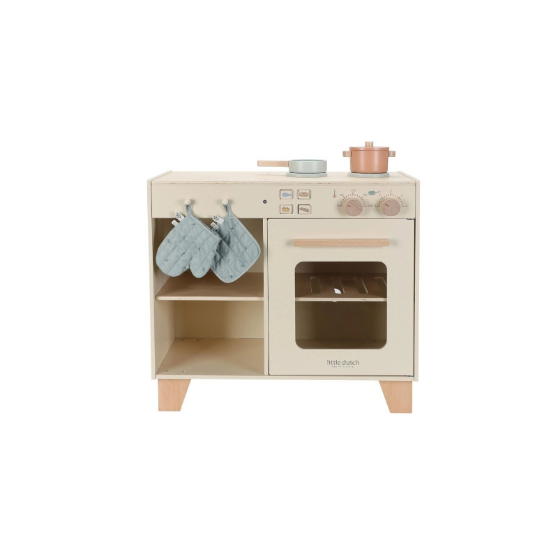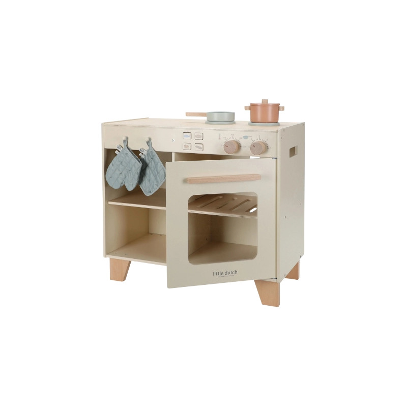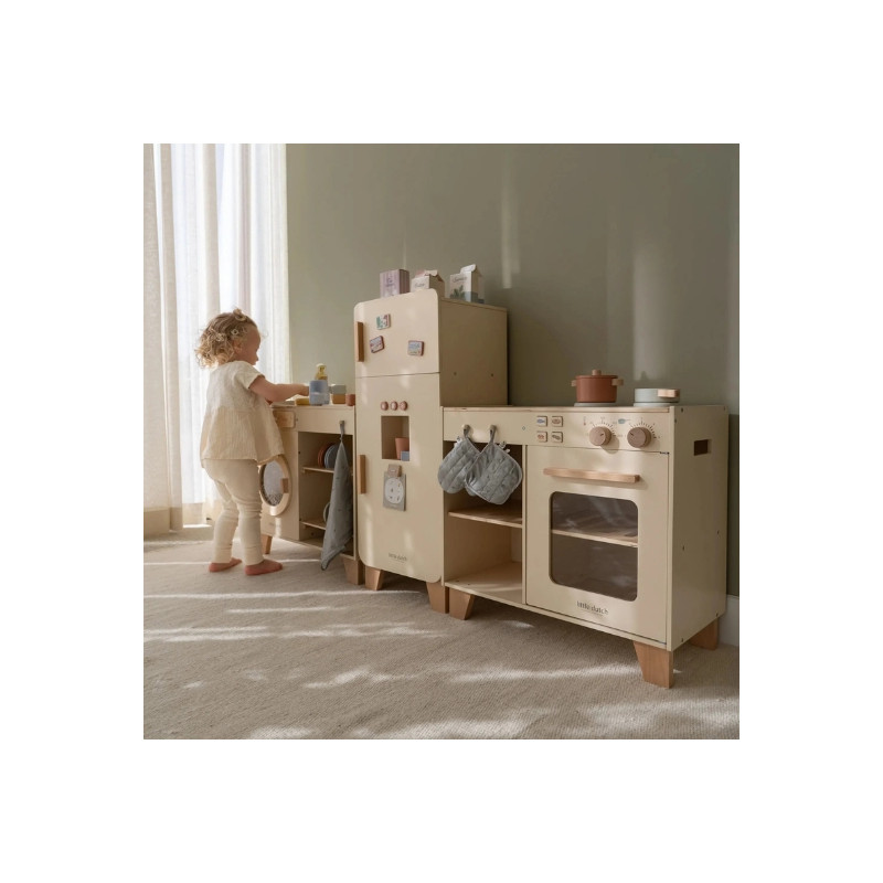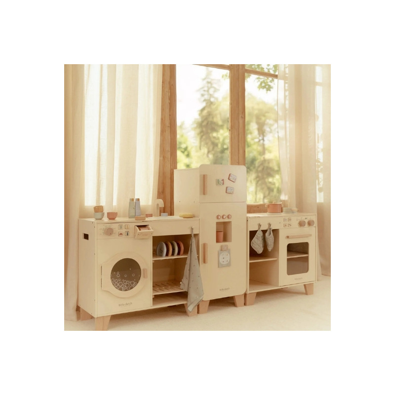 Avis aux petits chefs ! Cette magnifique station de cuisine en bois est idéale pour imaginer et préparer de délicieux plats. Les enfants peuvent faire cuire un gâteau dans le four, mijoter des légumes sur la cuisinière ou utiliser les accessoires inclus : deux casseroles, un gant de cuisine et un mur de four. Les boutons-poussoirs illustrés ajoutent encore plus de réalisme au jeu. À combiner avec le réfrigérateur ou le set lave-linge/lave-vaisselle pour créer une cuisine de jeu complète et immersive. De quoi inspirer des heures de créativité culinaire !