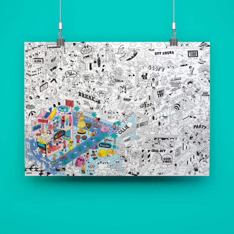 Vos enfants vont s'amuser sur cet espace artistique sans limites de chez OMY. Plongez dans le monde des skateurs et des surfeurs de la côte ouest avec ce coloriage géant. Votre enfant pourra s'amuser à le colorier seul, avec des amis ou en famille. Vous pourrez ensuite l'encadrer et vous en servir comme décoration.