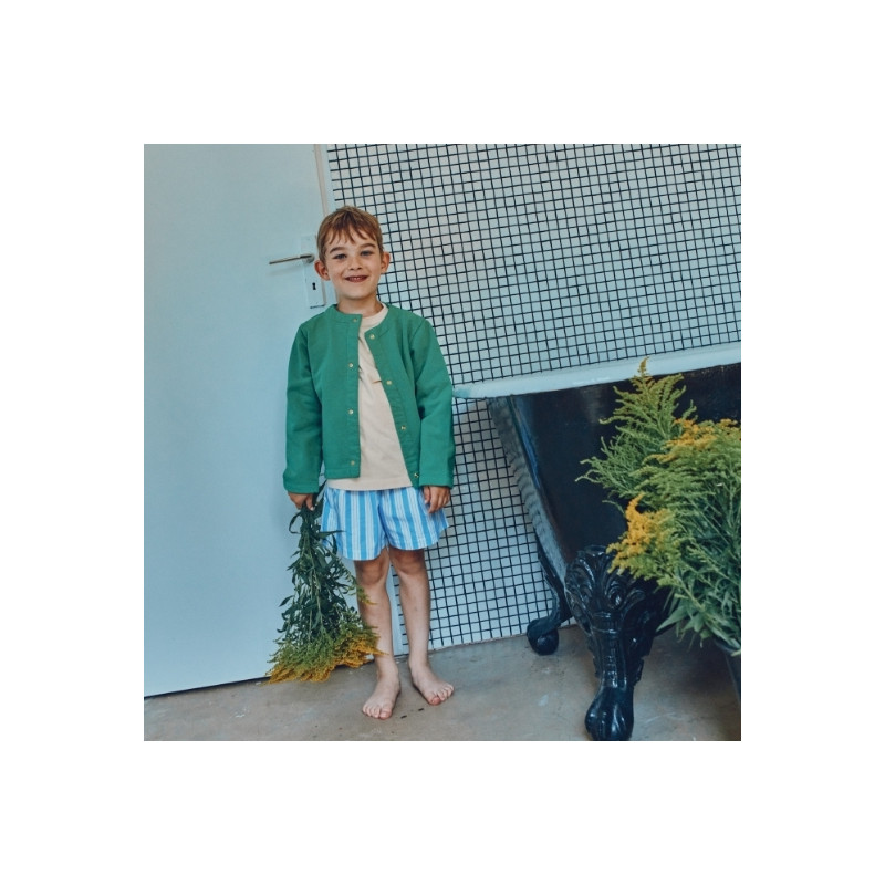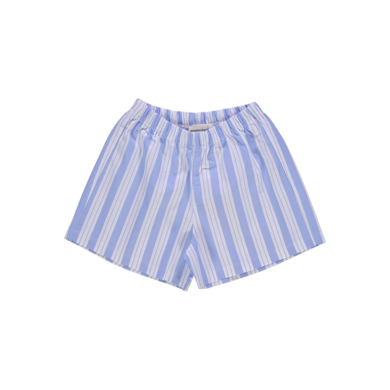 Short Gui enfant Poudre Organic à rayures bleues. Léger et confortable, idéal pour les journées ensoleillées.