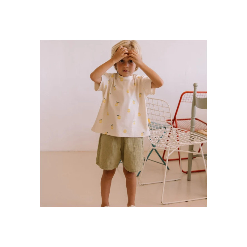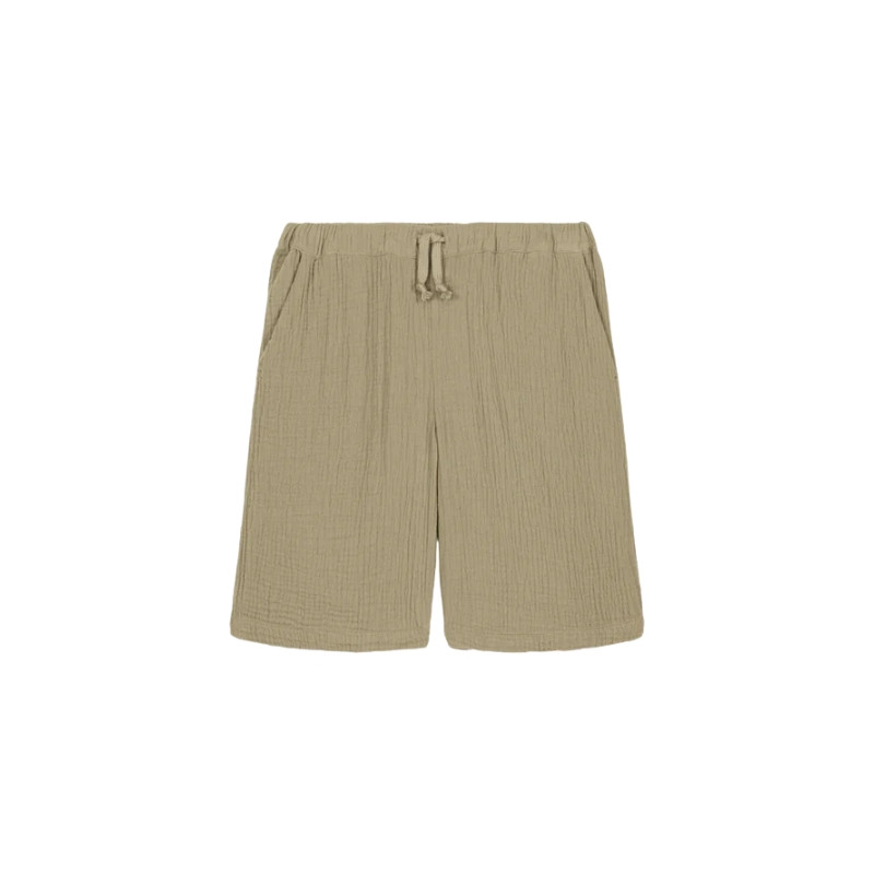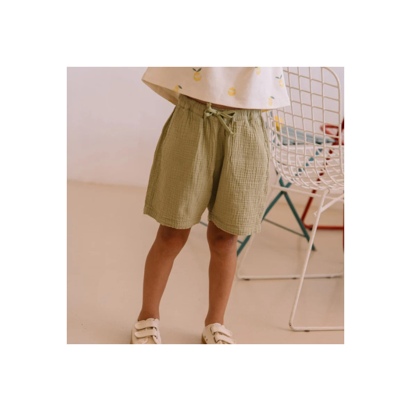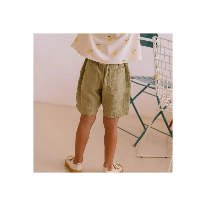Bermuda Basile golden green Studio Bohème. Coupe confortable, taille élastiquée et teinte naturelle pour un look d’été facile à porter.
