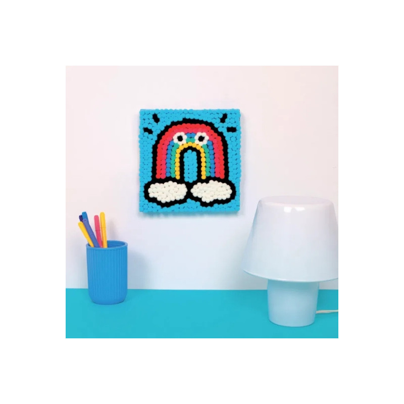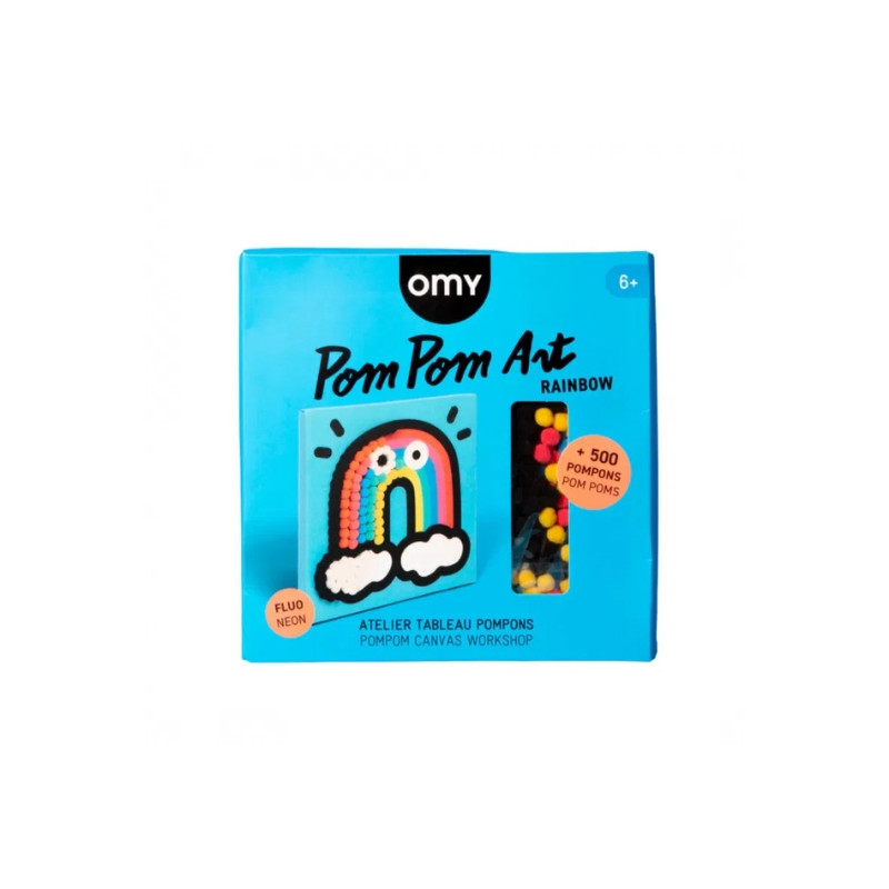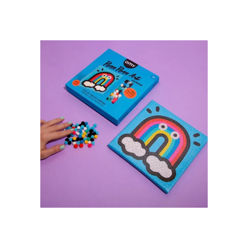 Pluie de couleurs et explosion de fun avec ce kit pom pom art signé OMY ! Laissez les petits artistes donner vie à un arc-en-ciel fluffy en collant plus de 500 pompons colorés sur une toile autocollante.