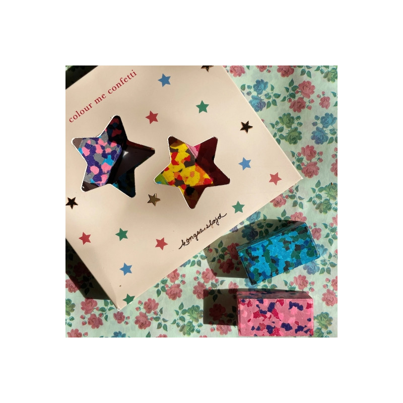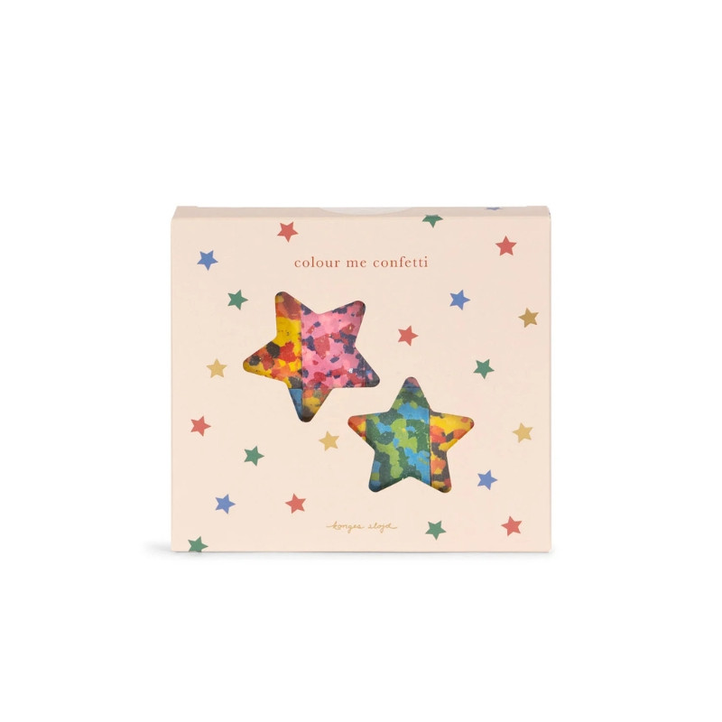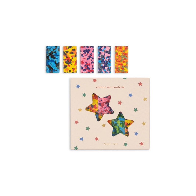 - 8 crayons multicolores façon confettis pour dessiner des arcs-en-ciel, des chats à pois, des fusées-pizza ou tout ce qui sort de l'imagination débordante de votre mini Picasso.