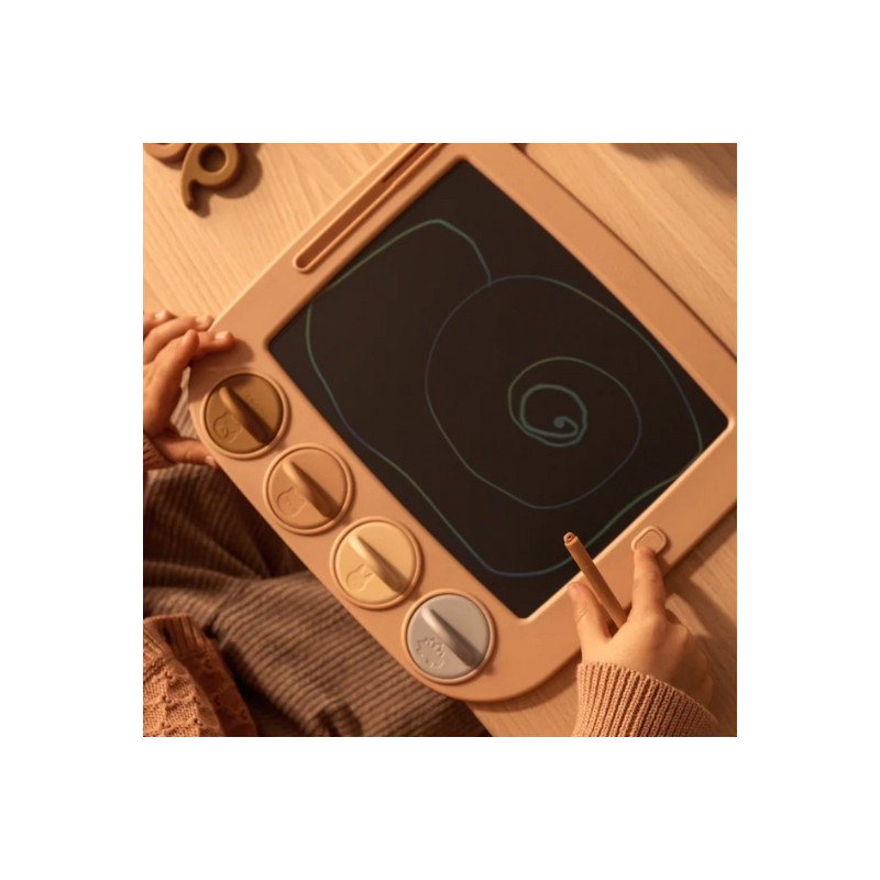 Le tableau à dessin LCD Ours de Liewood stimule la créativité des enfants grâce à son écran réutilisable, son stylo intégré et ses 4 tampons en silicone pour des formes instantanées. Compact et léger, il est idéal à emporter partout. Pratique, il dispose d’un bouton d’effacement, d’un verrouillage d’écran pour sauvegarder les dessins et d’un porte-stylo sécurisé. Une alternative ludique et durable au papier pour accompagner les petits esprits créatifs.