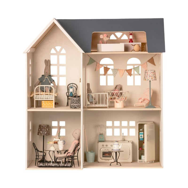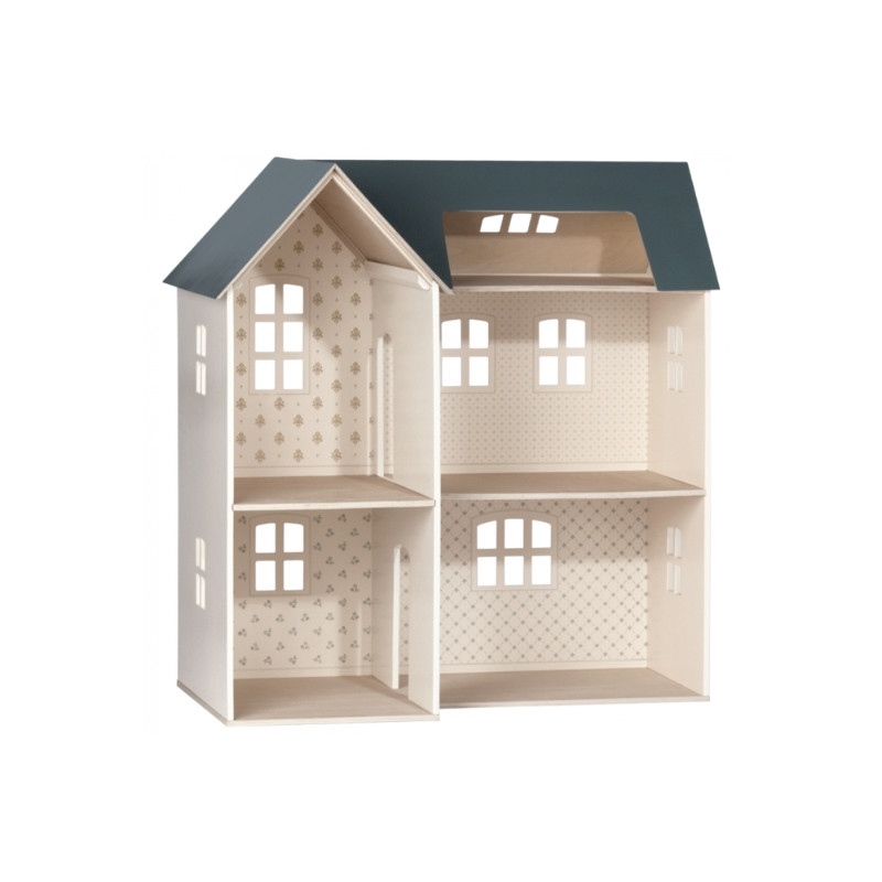 Découvrez la majestueuse maison de poupée en bois de la marque Maileg. Elle est idéale pour jouer avec tout l’univers des amis maileg : lapins, souris, cerfs, chevaux, … Spacieuse, elle a deux étages et peut être aménagée avec le mobilier spécialement conçu pour cette maison. Elle dispose de quatre chambres ainsi que d’un étage mansardé avec lucarne. Le mobilier et les accessoires ne sont pas inclus. Vous pourrez trouver chez little&tall tout le mobilier Maileg. La maison Maileg est à monter entièrement par vos soins.