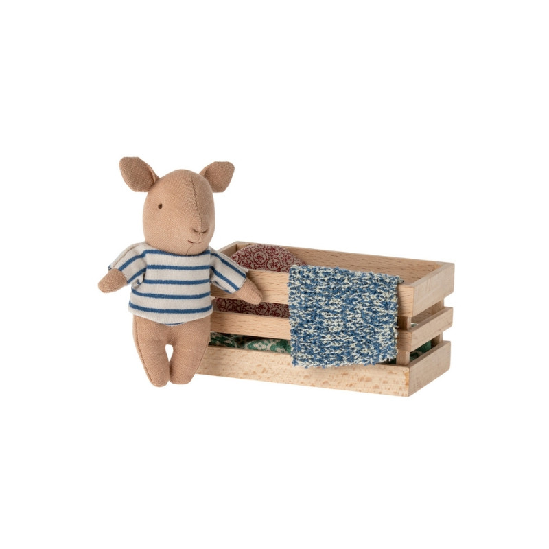 Découvrez chez little&tall, le bébé cochon dans sa caissette de la marque Maileg. Ce cochon vêtu d'une marinière coloris "bleu" est prêt pour des heures de jeux. Il dort paisiblement dans une petite caissette en bois. Les vêtements et le linge de lit sont faits de tissu doux avec de jolis imprimés.
