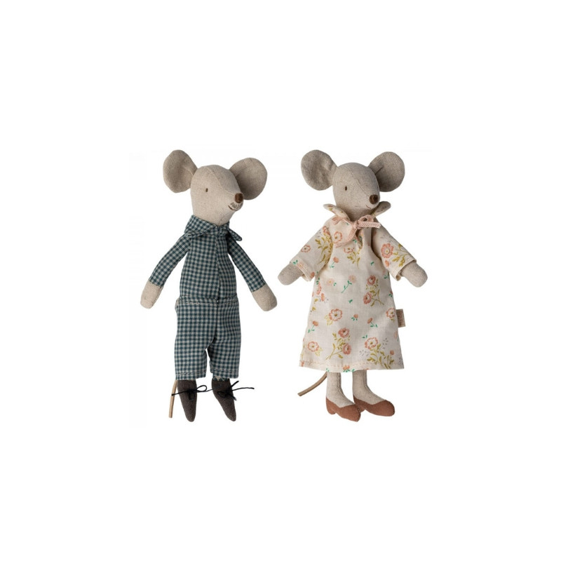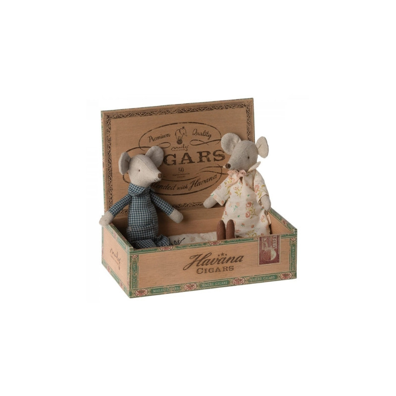 Découvrez les souris Maileg grand-mère et grand-père dans leur boîte. Ils sont disposés dans une jolie boîte à cigares qui leur sert également de lit. Ces souris disposent de superbes pyjamas et d'une couverture bien douillette, de quoi passer une bonne nuit et faire de beaux rêves !