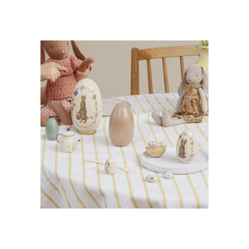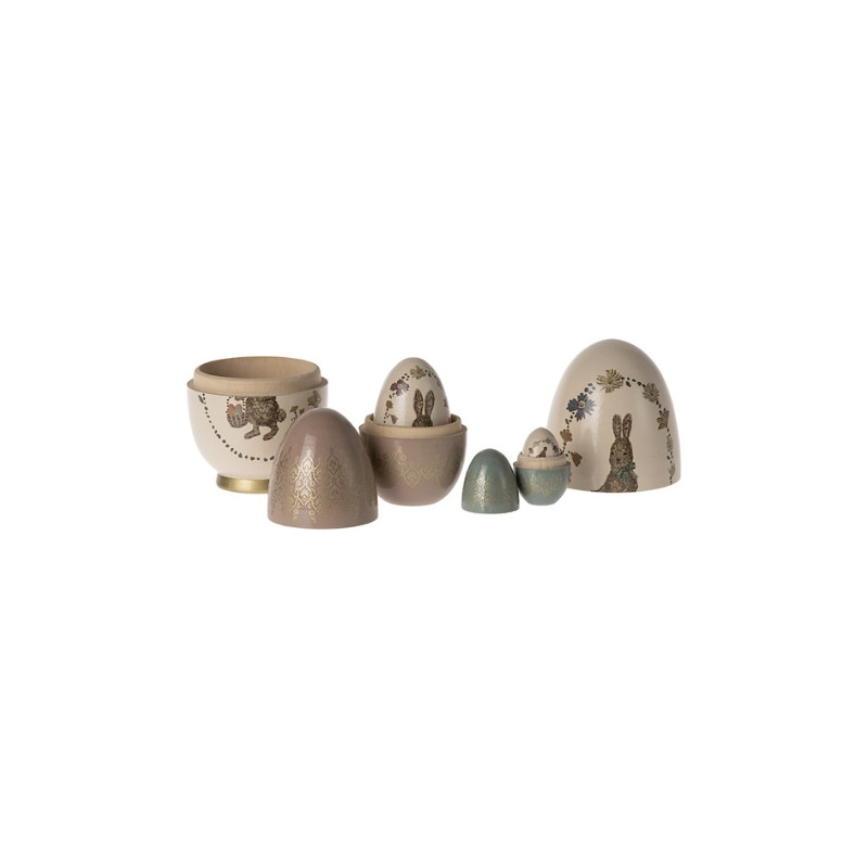 Pour Pâques, optez pour ce set d'oeufs babushka Maileg ! Ces 5 oeufs en bois de tailles différentes se cachent les uns dans les autres. Glissez-y une surprise dans chaque oeuf : une mini peluche Maileg, des chocolats ou n'importe quel petit objet qui fera plaisir à votre enfant. Vendus sans contenu.