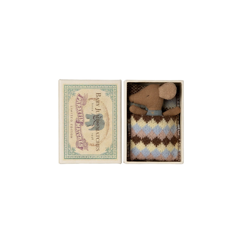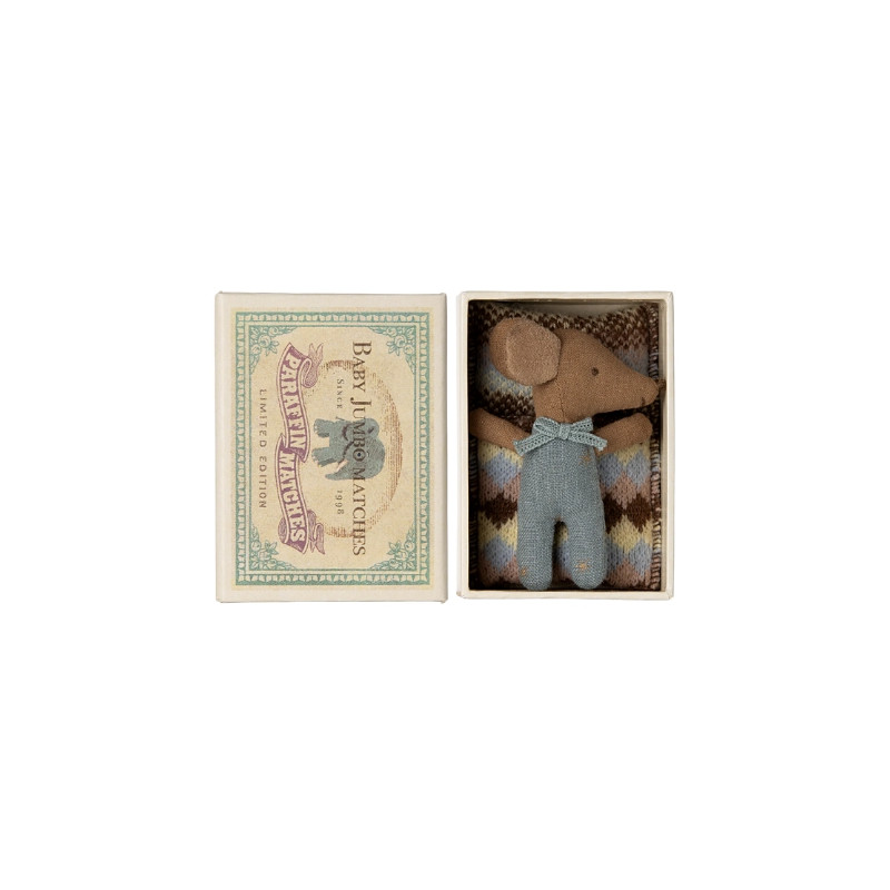La souris bébé "sleepy walkey" de chez Maileg promet des moments de jeu magiques. À moitié endormie, cette petite souris sommeille au chaud dans sa boîte confortable, se reposant pour des heures de jeu sans fin. Fabriqués dans des tissus aux imprimés uniques, ses vêtements et son linge sont d'une douceur et d'une élégance qui encourageront l'imagination de vos tout-petits. Également disponible en rose.