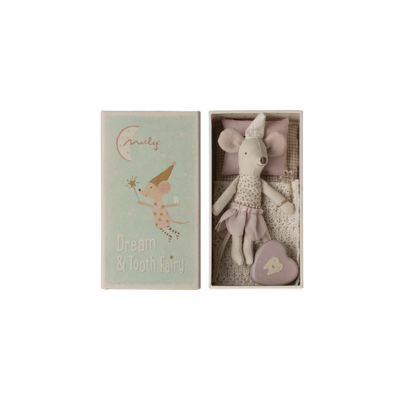 Cette adorable souris fée des dents de chez Maileg dans sa version "petite soeur" est le compagnon parfait pour rendre le rituel de la perte des dents encore plus magique. Avec sa jolie boîte à dents et ses vêtements doux, elle est prête à apporter de la joie et des rêves enchantés à votre enfant.