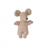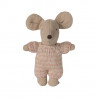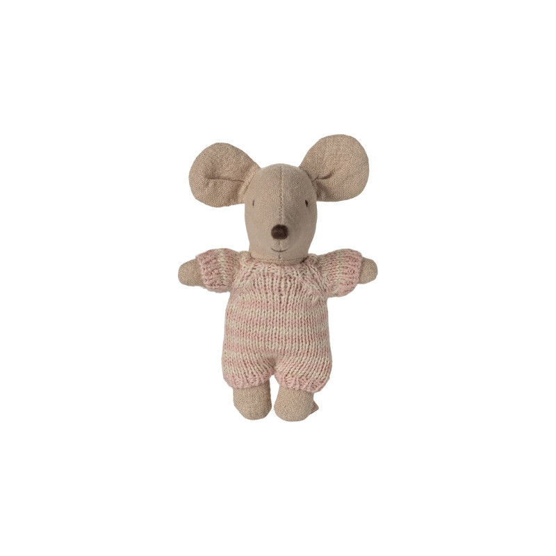 Un adorable bébé souris habillé d’une douce combinaison en tricot rayé, prête pour des heures de jeu et de tendresse. Elle se blottit confortablement dans son couffin matelassé, parfait pour l’emmener partout lors de vos aventures. Un petit compagnon charmant qui invite aux histoires, aux câlins et aux moments de douceur.