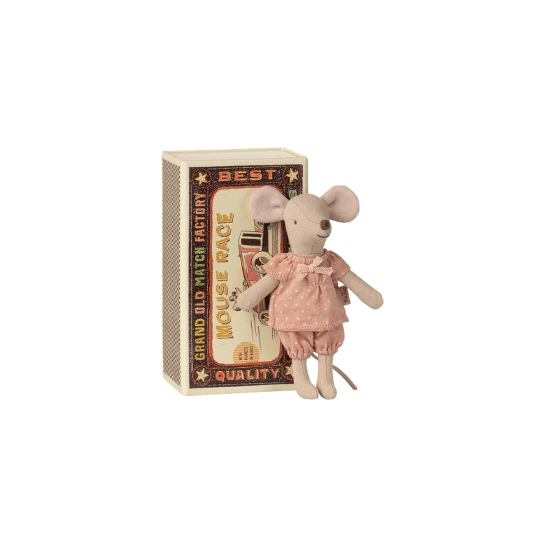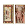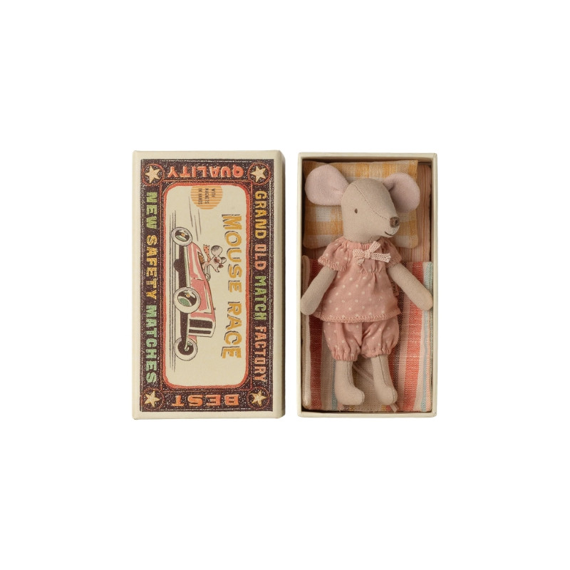 Une souris Maileg classique qui dort dans sa boîte d’allumettes avec literie douce et vêtements aux motifs délicats. Avec des aimants dans les mains, elle est parfaite pour