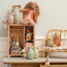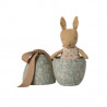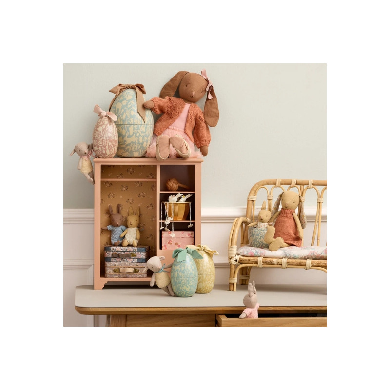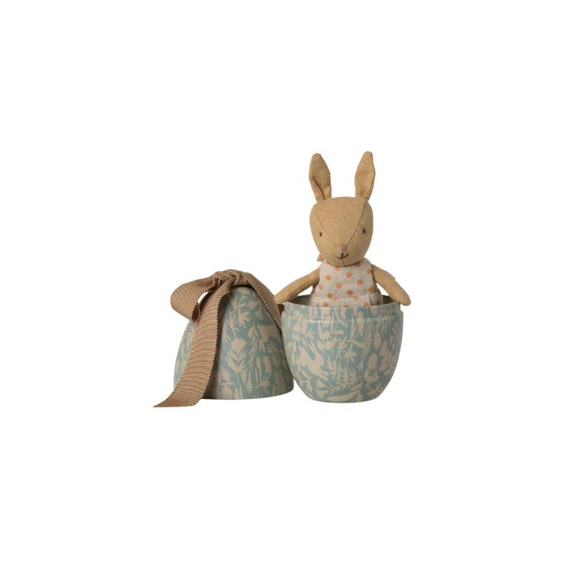 À l’intérieur de cet œuf en métal décoratif, orné d’un ravissant motif et d’un grand nœud souple, se cache un adorable lapin Micro prêt pour de nouvelles aventures. Vêtu d’une jolie tenue à pois, ce petit compagnon séduit par ses détails délicats et son charme intemporel. Grâce aux aimants intégrés dans ses mains, le lapin peut s’agripper à l’œuf et le tenir contre lui, ajoutant une dimension ludique au jeu. Cet ensemble poétique invite les enfants à imaginer de tendres histoires et constitue également un bel objet décoratif pour une chambre d’enfant.