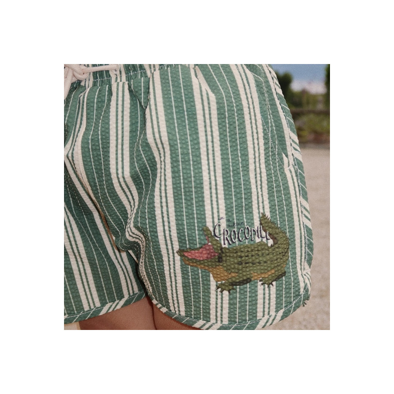 Préparez votre tout-petit pour l'été avec le short de bain bébé Konges Slojd en imprimé "pasture stripe". Ses rayures vert sapin et écru, son motif crocodile sur la cuisse gauche et ses deux poches latérales rendent ce short aussi mignon que pratique. Fabriqué en tissu gaufré seersucker, il offrira de la douceur et de la légèreté sur la peau de votre bébé pour un maximum de confort. Avec son séchage rapide, il sera l'indispensable pour accompagner votre petit aventurier à l'eau durant tout l'été. Disponible en modèle bébé.