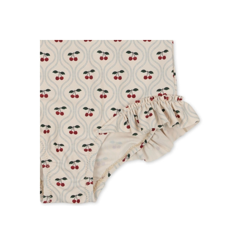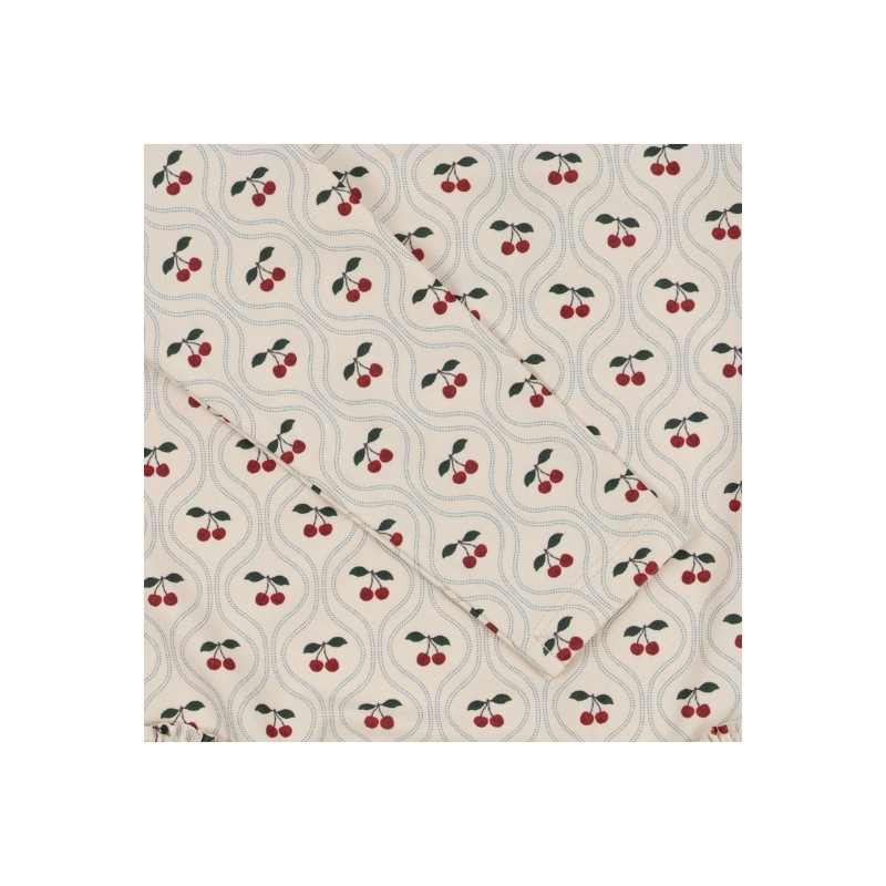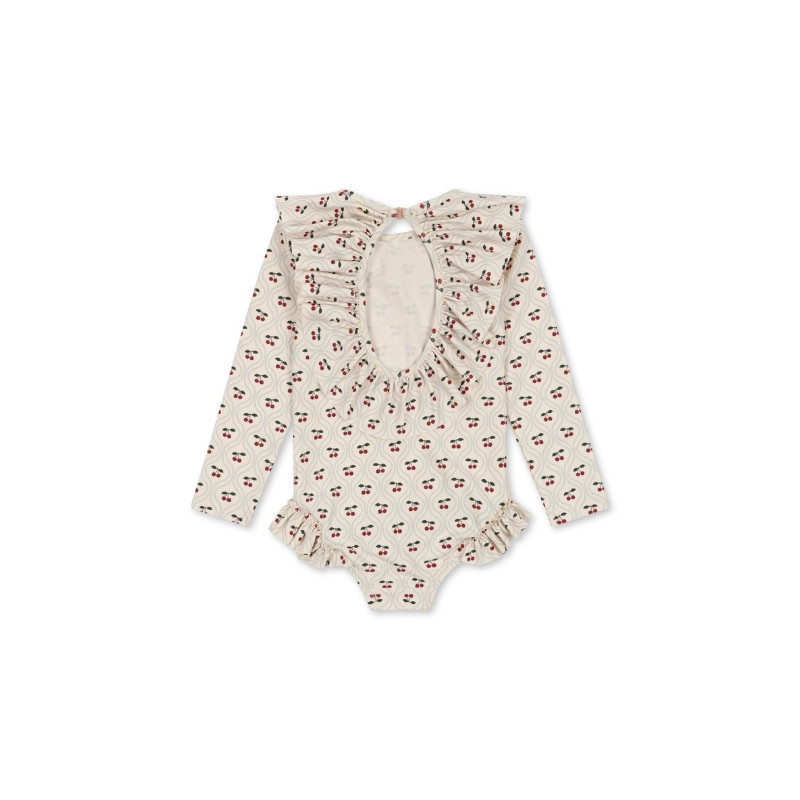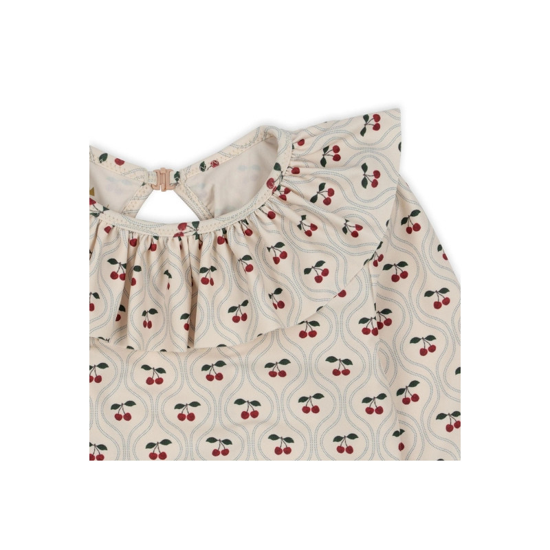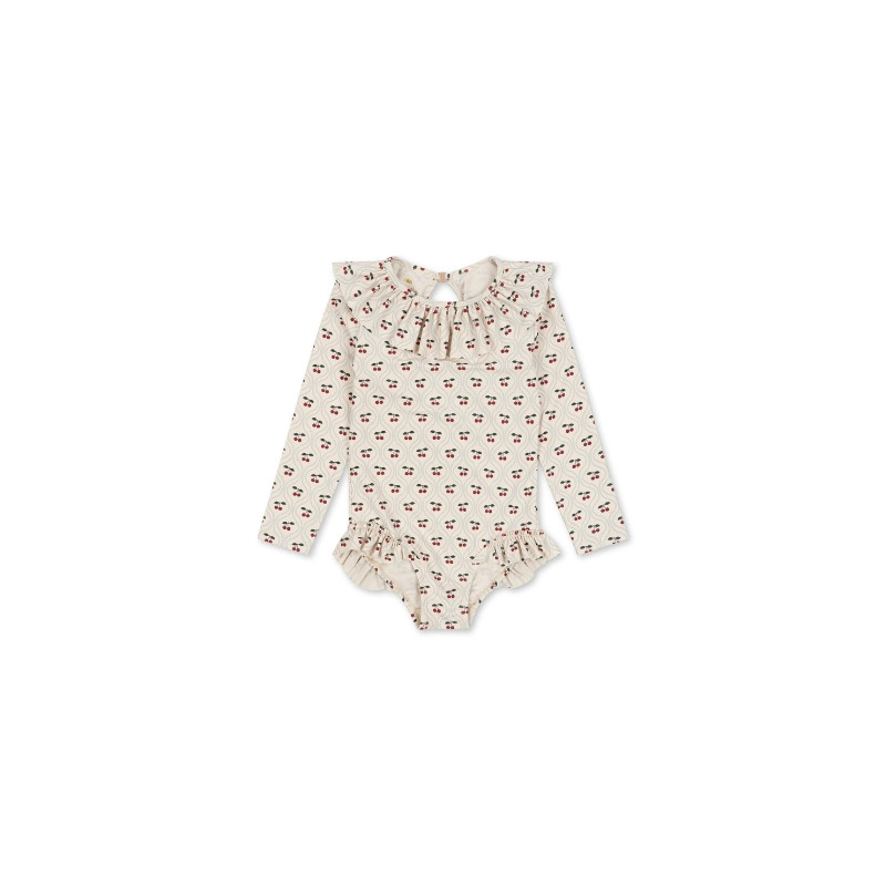 Le maillot de bain à manches longues de Konges Slojd est conçu pour offrir une protection optimale et un style charmant à votre bébé. Il se distingue par son imprimé délicat de petites cerises rouges sur un fond beige avec des motifs ondulés. Le col et les ouvertures des jambes sont ornés de volants qui ajoutent une touche de féminité et d'élégance.