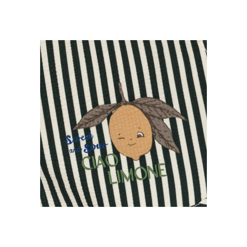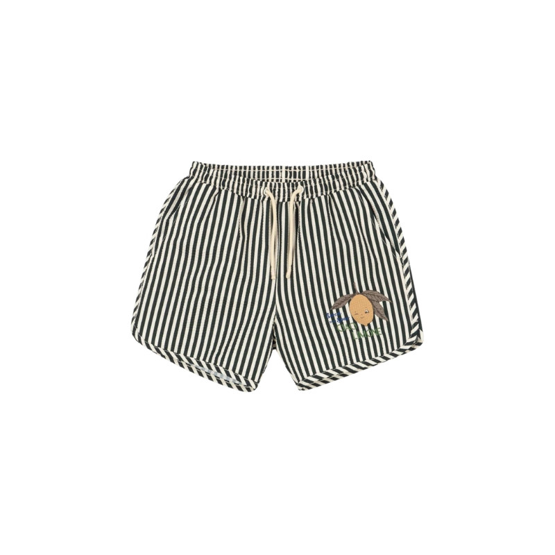 Voici le short de bain en seersucker de chez Konges Slojd, la pièce parfaite pour les petits rois du sable et les champions du plongeon artistique. Avec ses rayures espiègles et sa broderie "Cia Limone" façon club de vacances très privé, ce short coche toutes les cases du style estival rigolo et responsable.