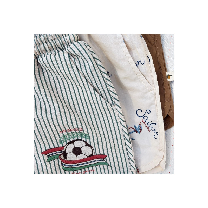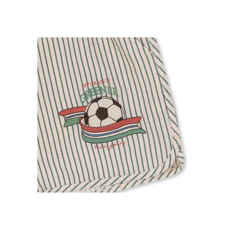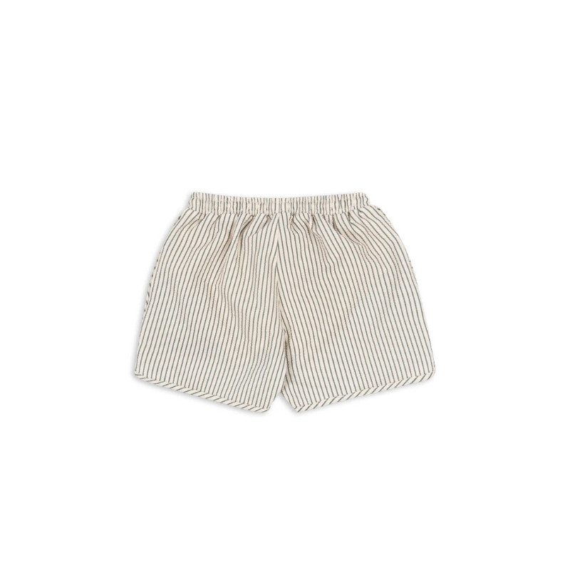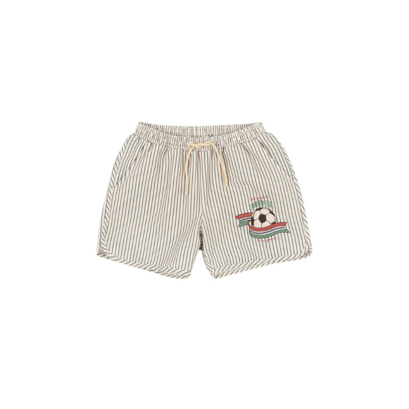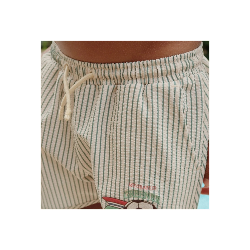 Quand la plage devient un terrain de foot imaginaire, il faut un short à la hauteur de l’événement ! Ce short de bain Konges Slojd en seersucker léger et texturé est parfait pour courir, sauter, plonger. Doté d’un cordon de serrage ajustable, il reste bien en place, même pendant les plus folles parties de beach soccer.