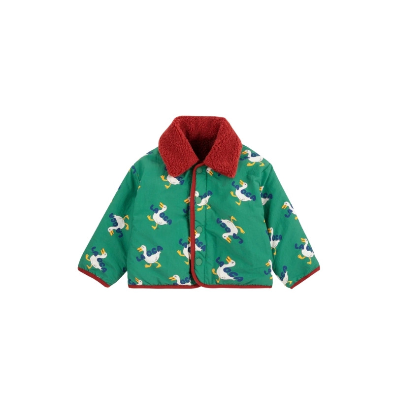 Le manteau réversible bébé La Oca de chez Bobo Choses allie chaleur et praticité avec sa doublure douce, son imprimé ludique et sa face unie pour varier les styles.