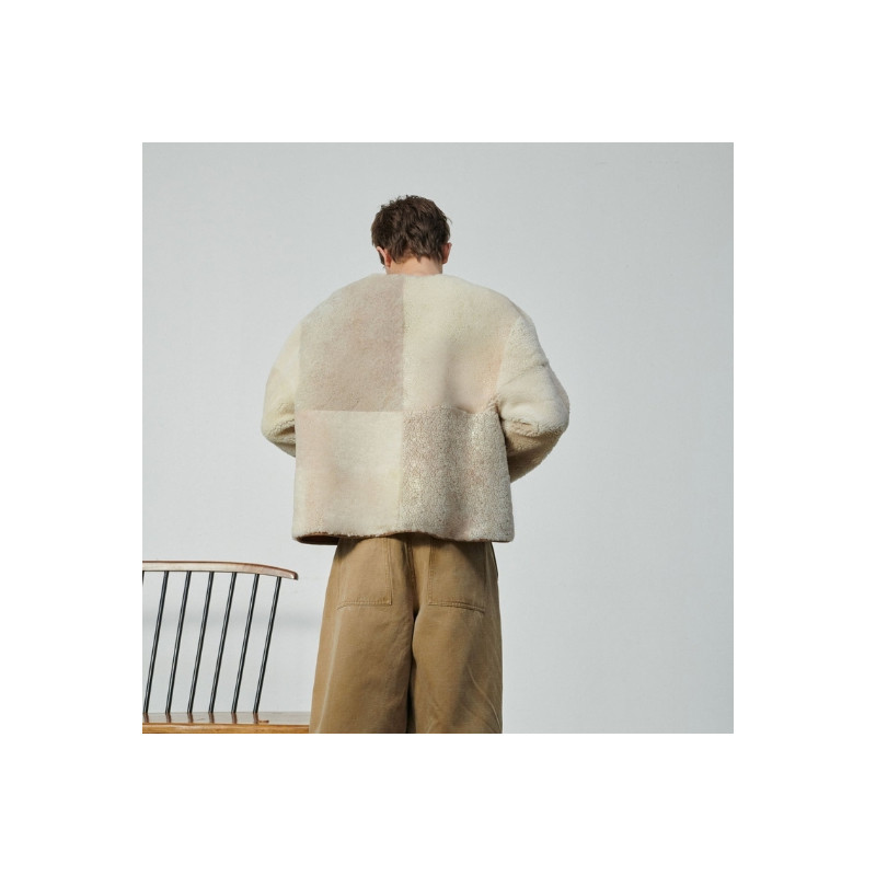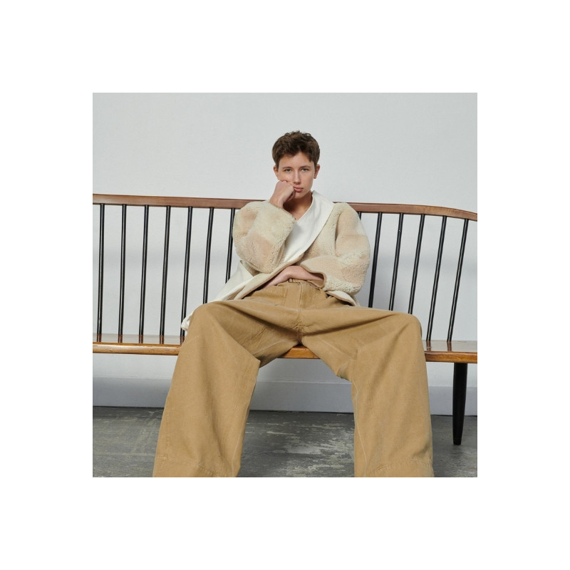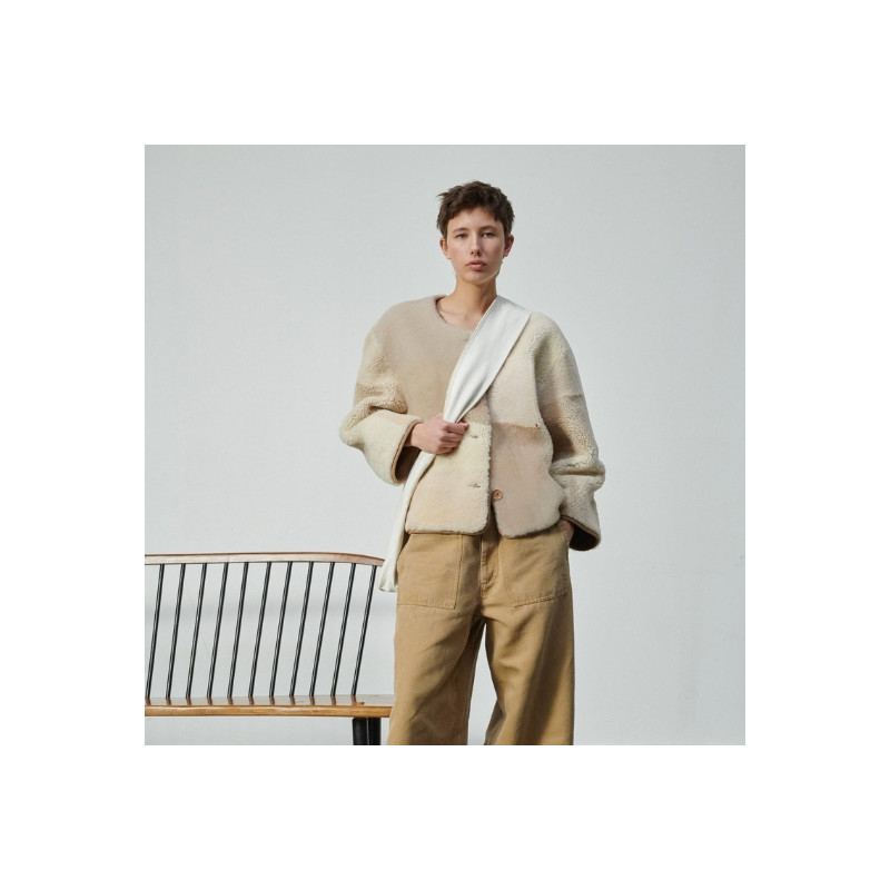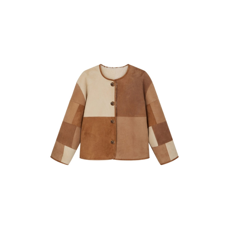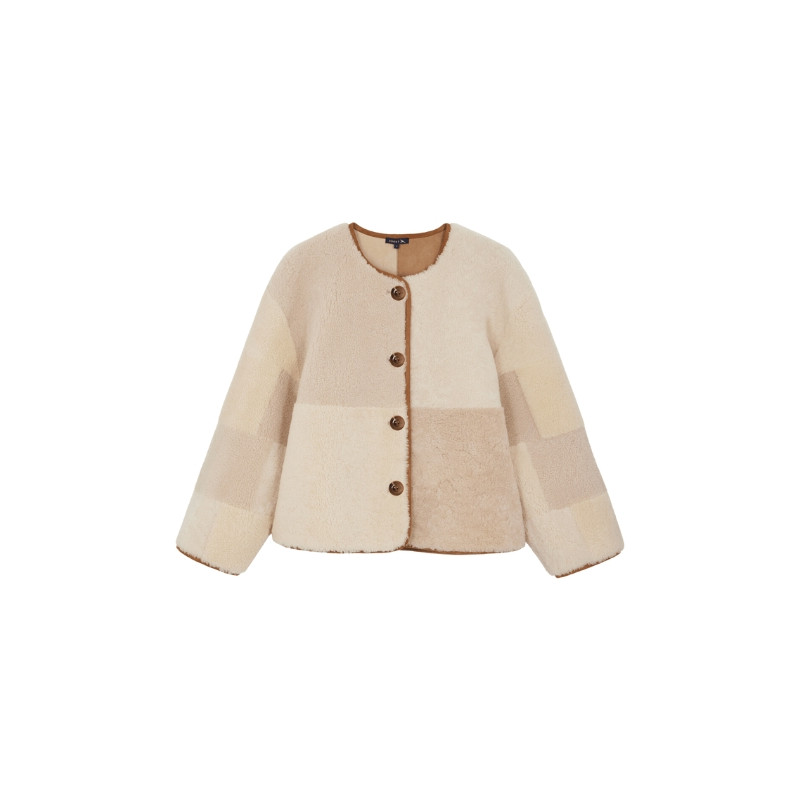 Ce blouson court en peau lainée patchwork réversible de la marque Soeur est confectionnée en 100% cuir d'agneau. Le manteau Woori a une coupe courte et ample. Évitez la pluie et prenez conseil auprès d'un spécialiste pour imperméabiliser.