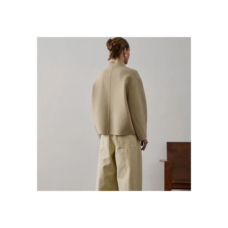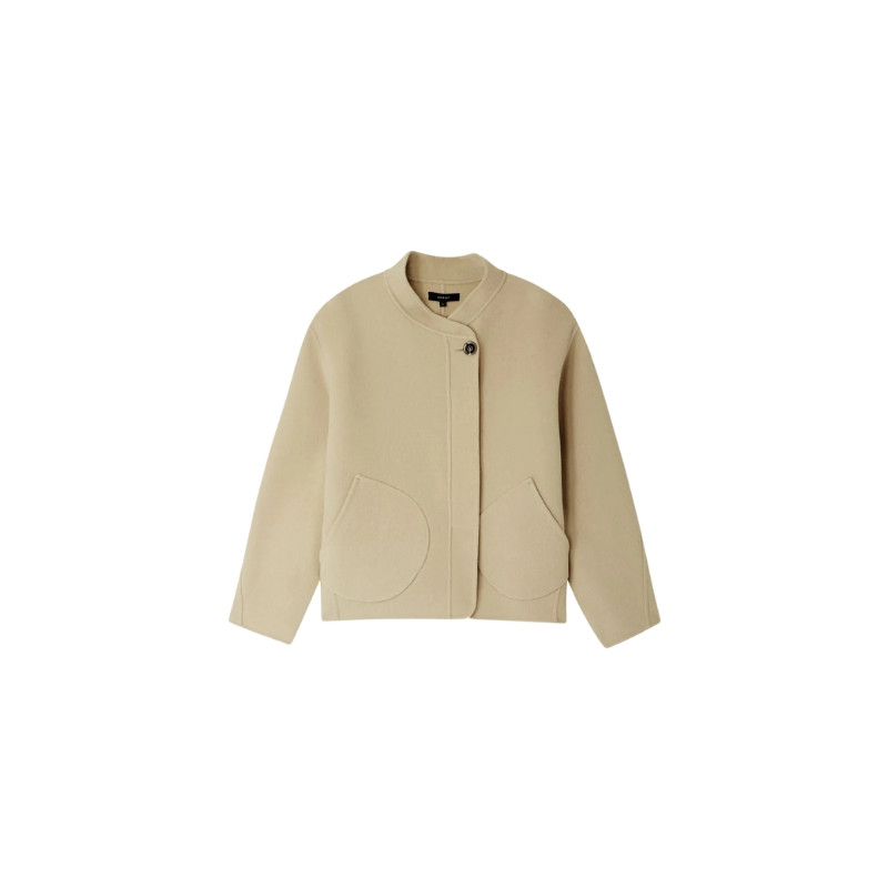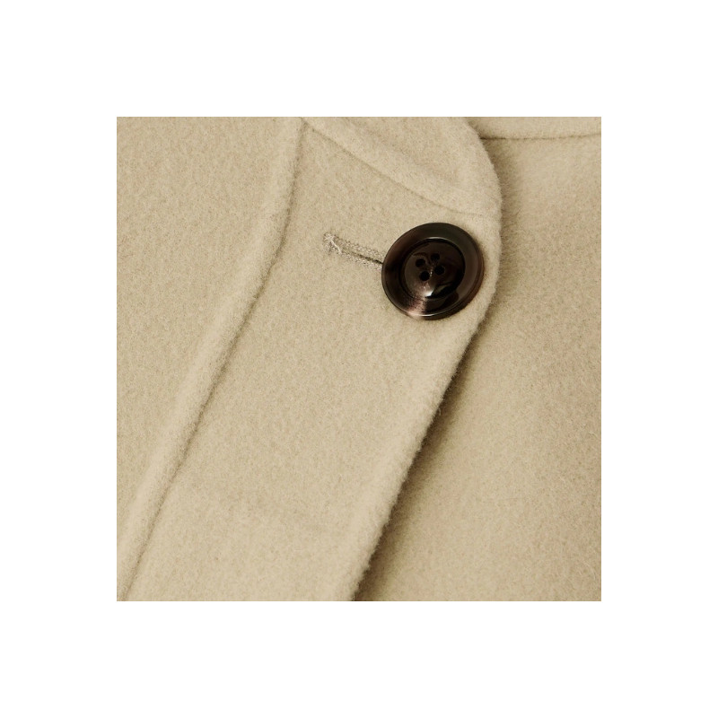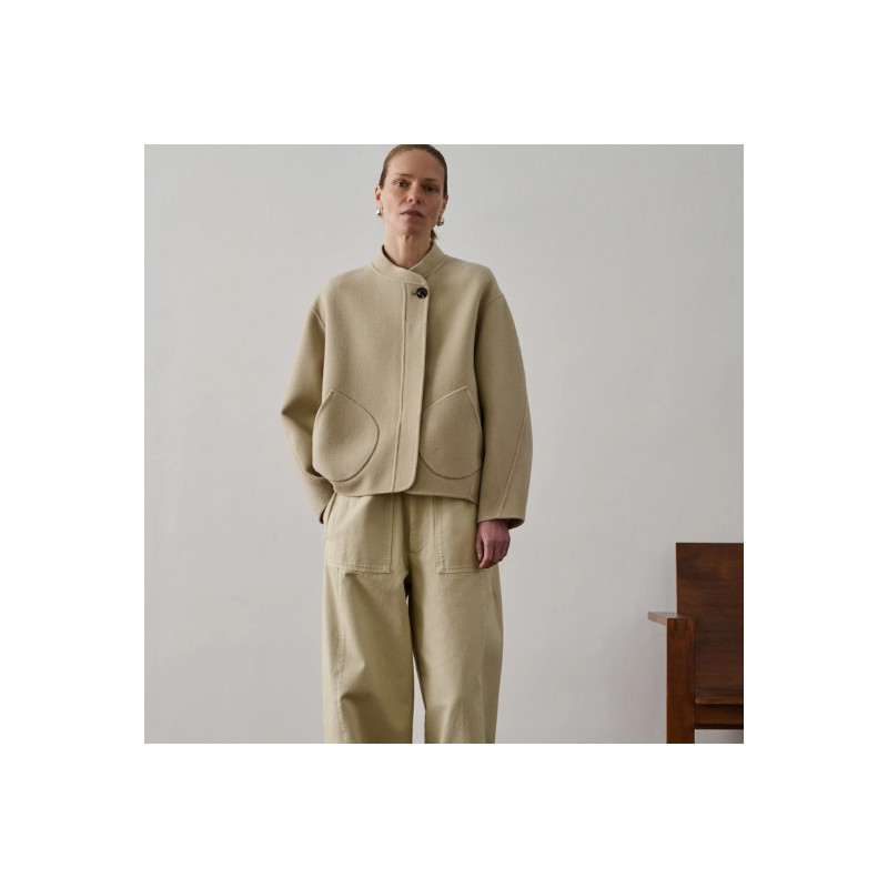 Le manteau Windsor de Soeur présente une coupe courte et ample en laine double face, avec col asymétrique, ouverture boutonnée discrète et deux poches plaquées.