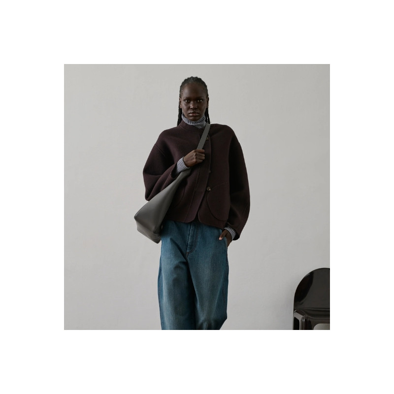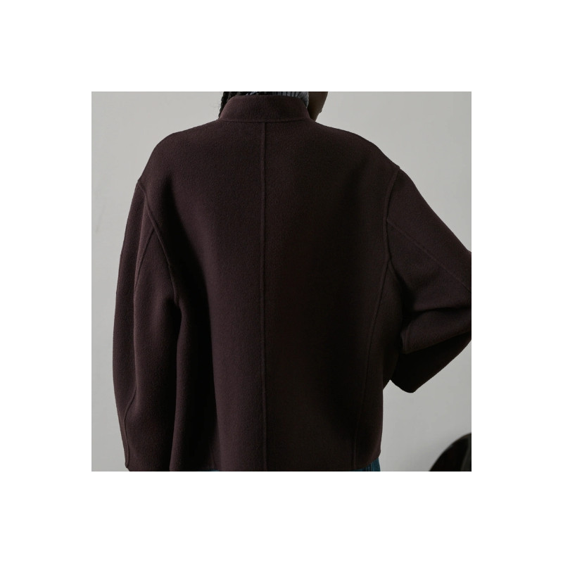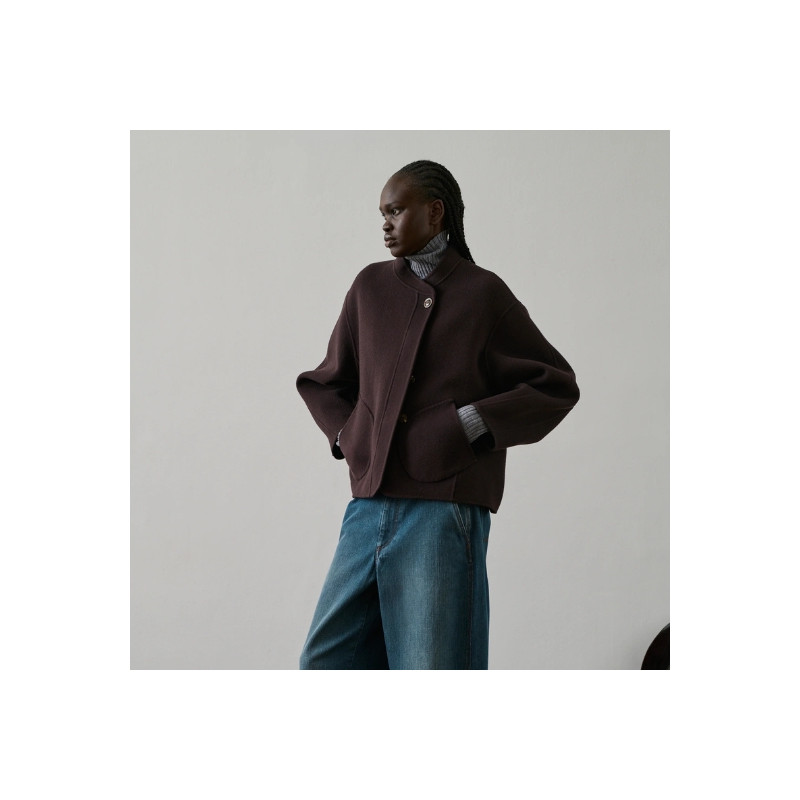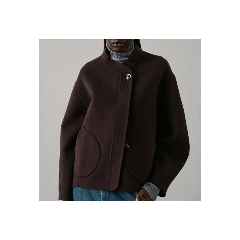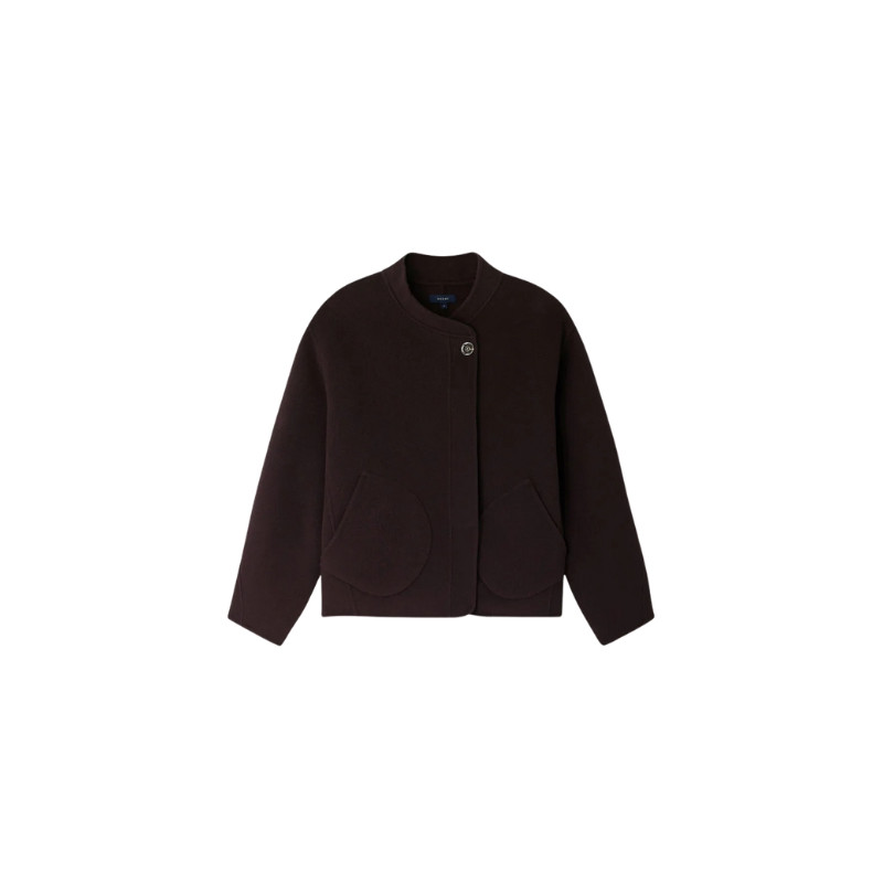 Le manteau Windsor de Soeur, en laine double face, offre une coupe courte et ample avec col asymétrique, fermeture boutonnée discrète et poches plaquées pour un style chic et décontracté.