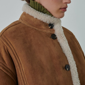 Le manteau Fabio de la marque Soeur est un manteau court en peau lainée d’agneau, à coupe arrondie avec col assorti, ouverture boutonnée, poches passepoilées et effet boule au dos.
