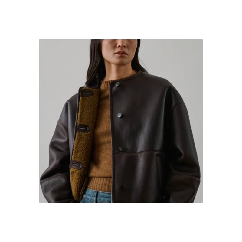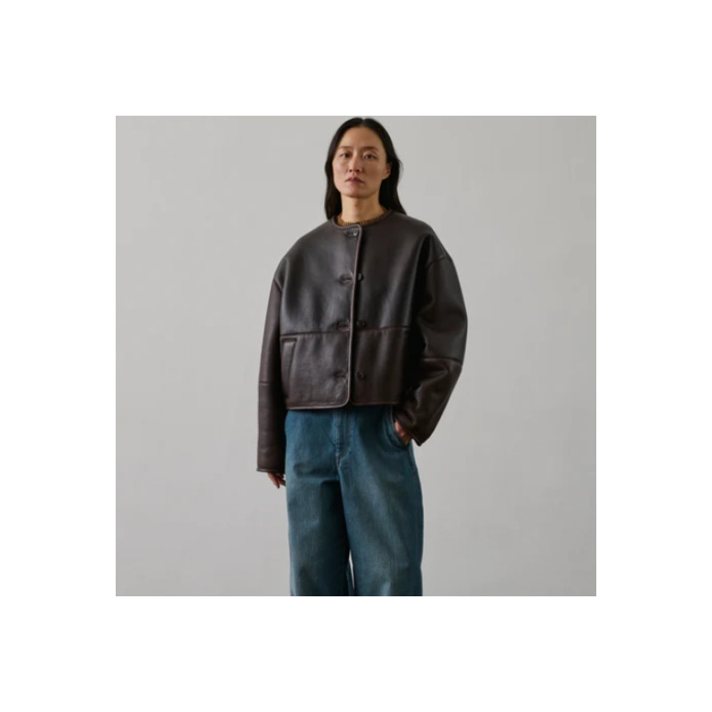 Le manteau Fabio de chez Soeur est un manteau court en peau lainée d’agneau, au tombé moderne et élégant. Sa coupe arrondie et son col assorti apportent une touche de douceur, tandis que son ouverture boutonnée et ses deux poches passepoilées devant ajoutent praticité et style. Des pinces au dos dessinent un subtil effet boule pour une silhouette structurée et contemporaine.