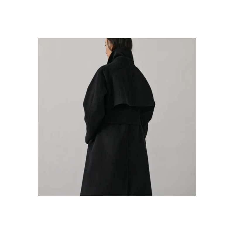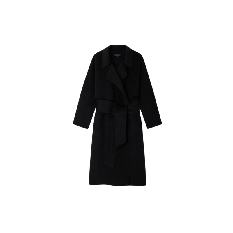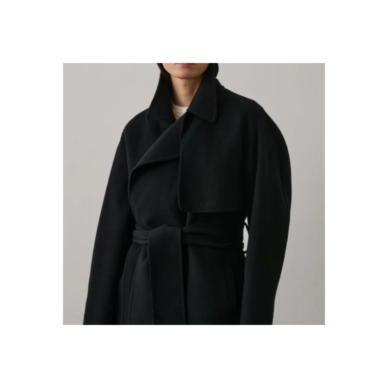 Le manteau Stanislas de la marque Soeur est une pièce ample et élégante avec col caban, manches raglan, poches passepoilées et ceinture amovible pour ajuster la silhouette.