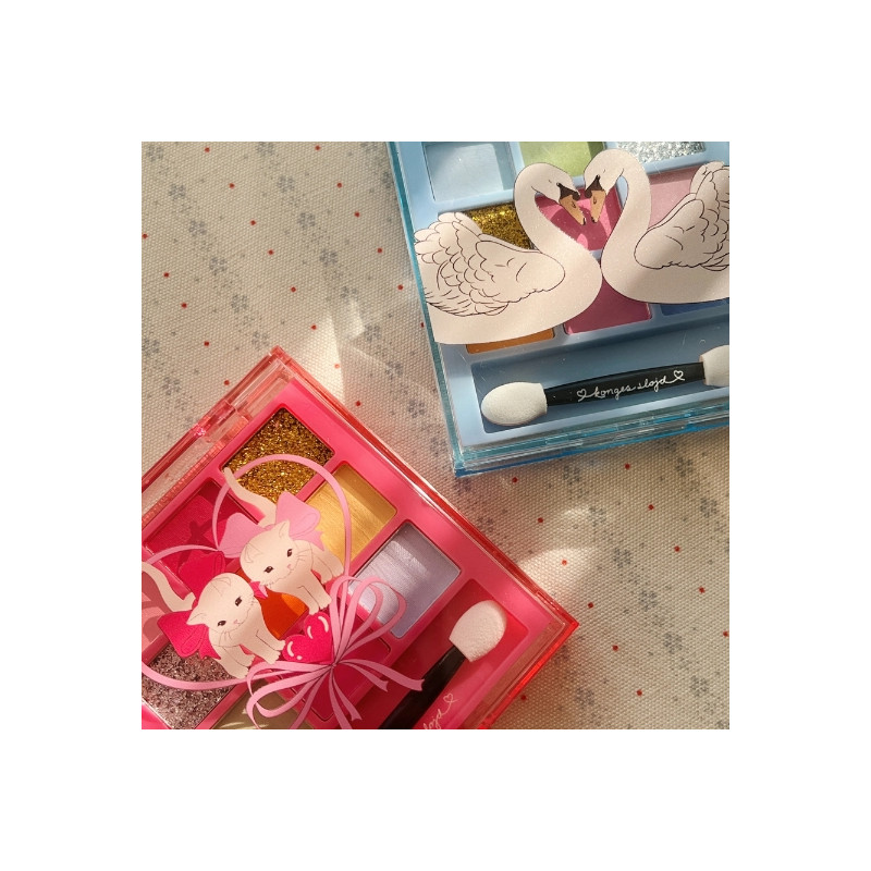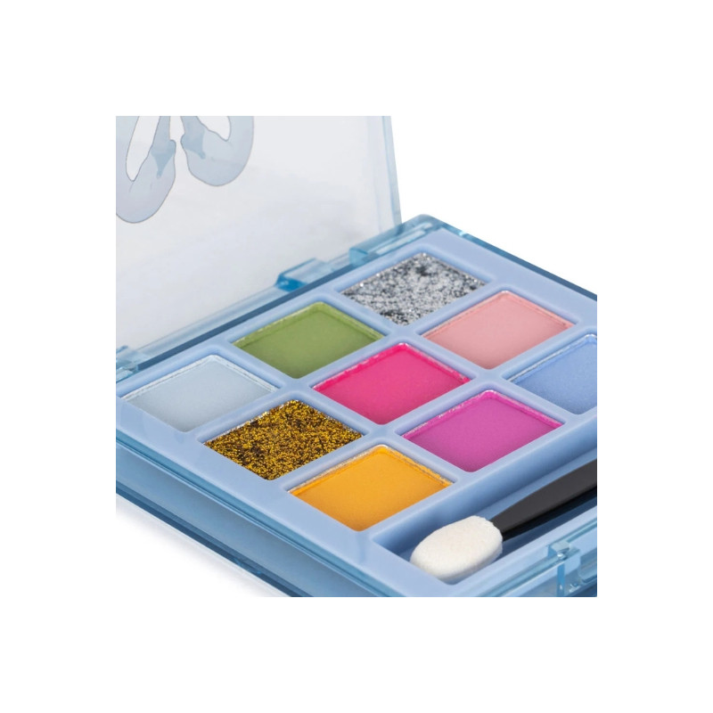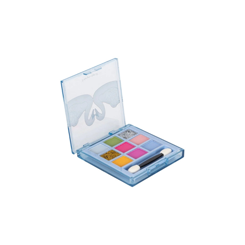 Palette de fards à paupières aux teintes vives et scintillantes, parfaite pour un maquillage ludique et coloré.