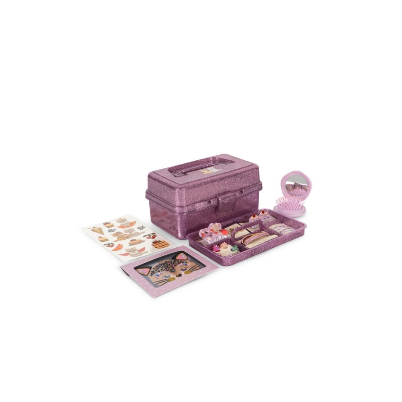 À l’intérieur, on retrouve une sélection d’accessoires pratiques : pinces à cheveux, élastiques, miroir et brosse, soigneusement organisés dans une jolie valise facile à transporter. Parfaite pour jouer à la maison ou à emporter partout, elle accompagne les moments de jeu avec créativité et imagination.