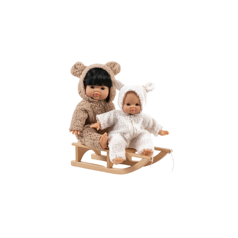 Découvrez la collection "Tout schuss !" de la marque Minikane, un clin d’oeil au film "Les Bronzés font du ski"! Cette jolie luge pour poupée de la marque Minikane est conçue en bois. Votre enfant pourra facilement tirer ses poupées grâce à une petite cordelette. Cette luge peut accueillir 2 poupées. Les  poupées préférées de votre enfant deviendront les reines de la glisse ! Convient aux poupées Gordis 34 cm ou Babies 28 cm. Retrouvez dès à présent sur notre eshop et dans notre boutique little&tall à Lille, la collection "Tout schuss!" de chez Minikane (combinaisons, luge, moufles, paires de skis...).