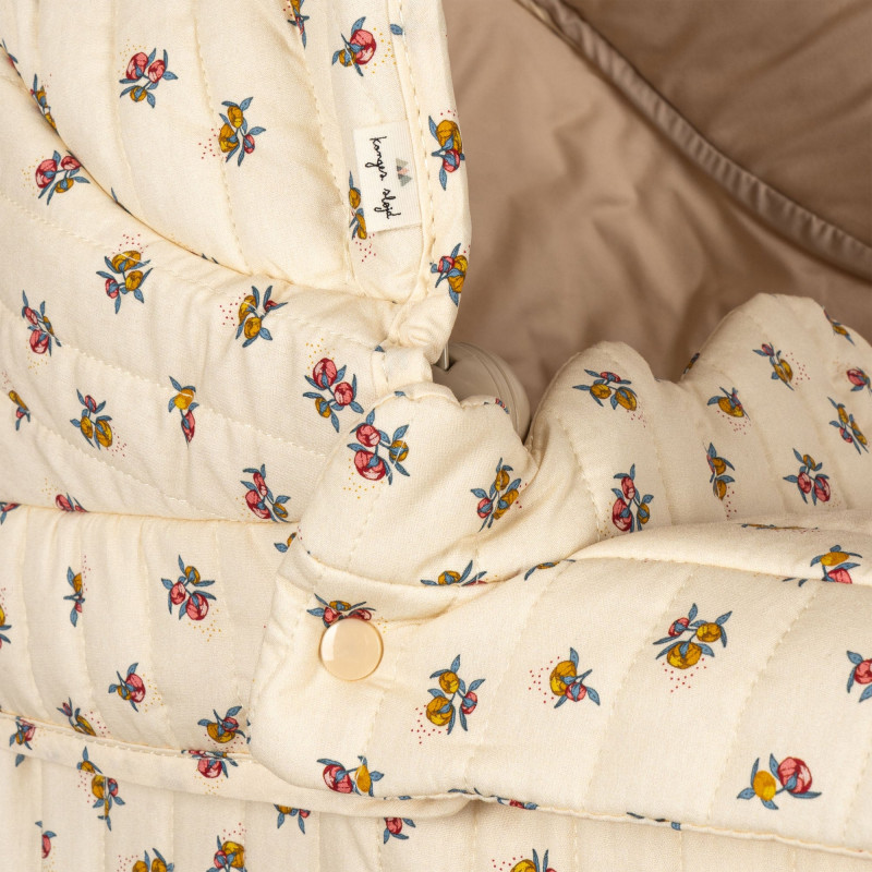 Pour des balades avec votre poupée, découvrez la poussette landau pour poupée imprimée "peonia" de la marque Konges Slojd. Elle est conçue avec quatre grandes roues pour une stabilité optimale. Elle dispose d'un joli tissu "écru" matelassé et d'un petit matelas en 100% coton biologique. Le cadre du landau est en métal avec des poignées toutes douces. Elle possède un panier de rangement légèrement rembourré. Le landau est facile à plier et à ranger.