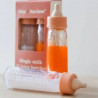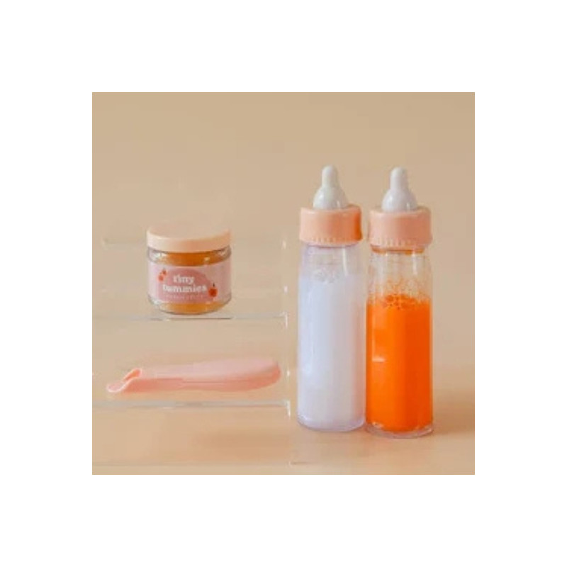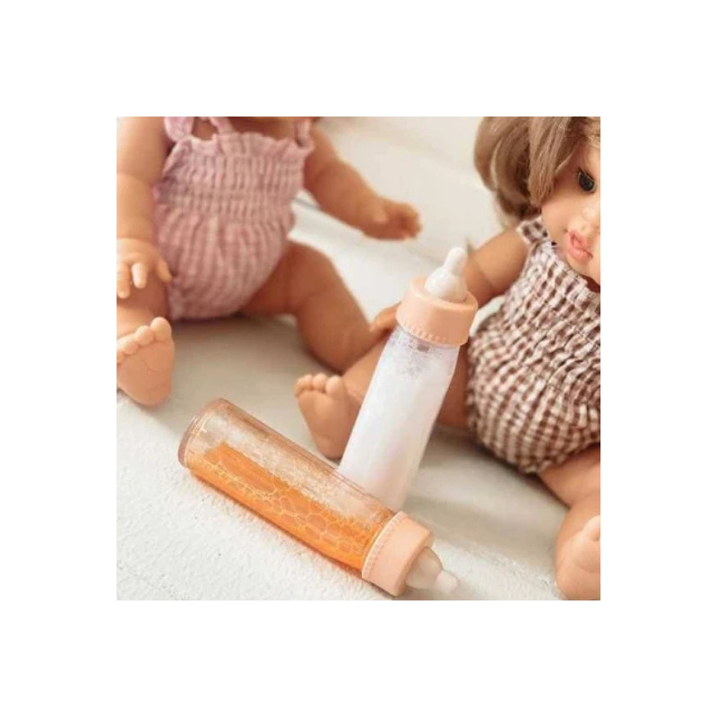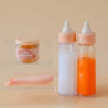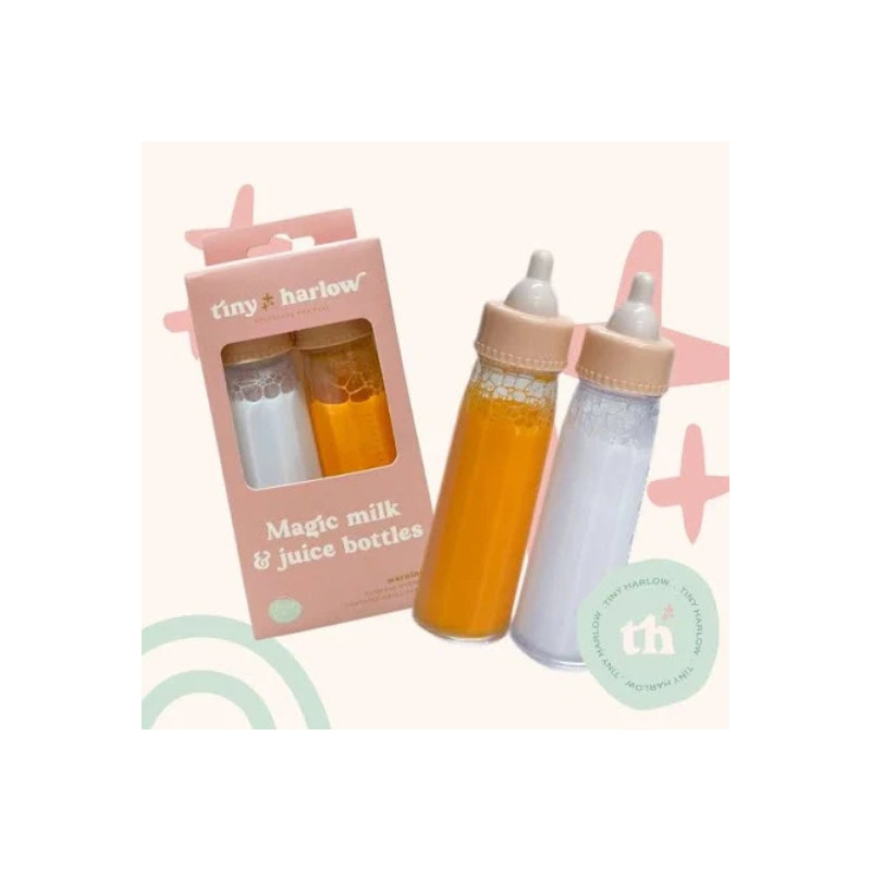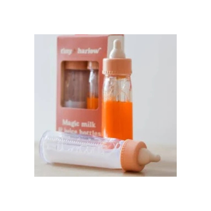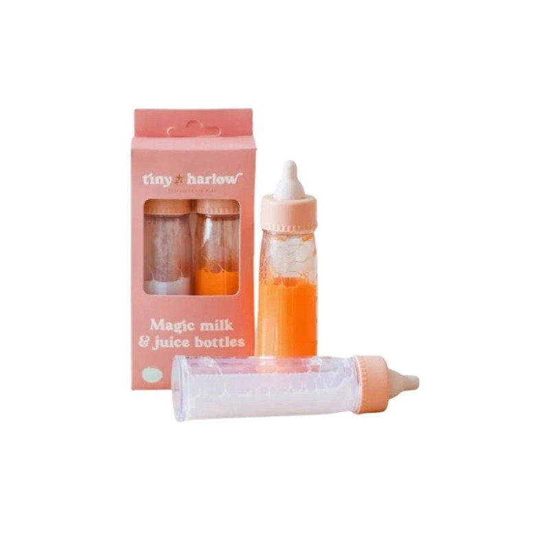 Duo de biberons magiques de chez Tiny Harlow lait et jus de fruit, avec effet liquide qui disparaît, parfait pour des jeux de poupées réalistes et ludiques.