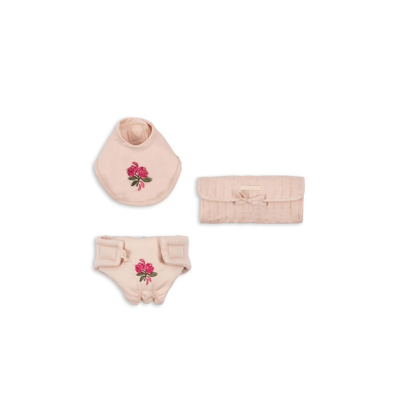 Cet ensemble complet comprend un bavoir, une couche avec fermeture velcro et un chiffon en coton doux. L’idéal pour équiper la chambre de la poupée préférée des enfants et enrichir leurs jeux d’imitation.