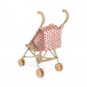 Une poussette stable et pratique avec harnais, sac, tissu amovible et châssis en fer à poignées souples.